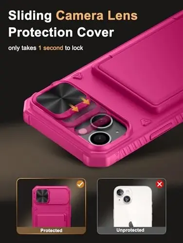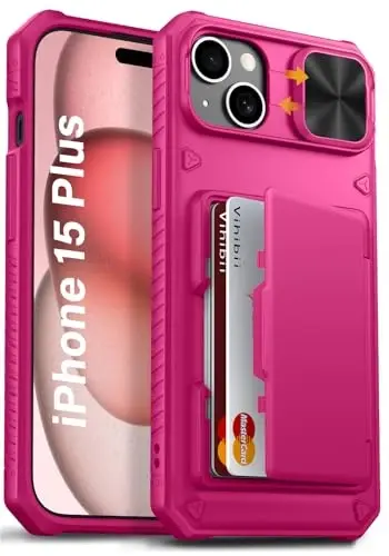 Vihibii 15 Plus/iPhone 14 Plus uchun kartali hamyon gʻilofi (4 ta karta), [RFID blokirovka] va sirgʻanuvchi kamera qopqogʻi va koʻtarilgan qirralar ekranini himoya qiladi, iPhone 15 Plus/ 14 Plus uchun ogʻir gʻilof, Toʻq pushti