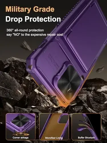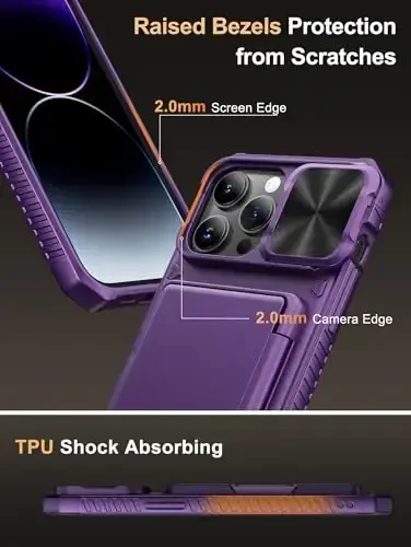 Protect your phone and simplify your life with the Vihibii iPhone 14 Pro Max Wallet Case! This stylish and practical case is specially designed for your iPhone 14 Pro Max 6.7" (2022) model and is equipped with [2025 Upgraded Version] features. Please note that this case is not compatible with iPhone 14 Pro, iPhone 14 Plus, iPhone 14, and other iPhone series. It is important to carefully check your phone model before purchasing. At Vihibii, we have a professional design and after-sales service team that takes responsibility for our products and customers. Thanks to this case, you will get rid of the need to carry a separate wallet and make your daily life more practical. With the special compartment on the back of the case, you can safely carry your credit cards, ID, or some cash. You can easily store 4-5 cards, depending on the thickness of your cards. Thanks to the newly developed structure, the card holder hinge position is fixed to the center of the phone case, eliminating the risk of falling and providing more secure protection for your cards and cash. The newly designed sliding camera protection cover of the iPhone 14 Pro Max case is 2mm thick and the sliding rail is sensitive. When you do not need to use the camera, simply slide the cover in one second to protect your iPhone 14 Pro Max phone lens from scratches and damage. The Vihibii iPhone 14 Pro Max case is equipped with advanced RFID protection technology. The built-in special protection layer can effectively isolate external RFID scanning signals and prevent unauthorized devices from reading the sensitive information of your credit cards. The active defense mechanism can proactively prevent electronic copying. It has been tested on more than 10,000 signal protection durability, ensuring long-lasting, stable performance and providing a solid guarantee for the security of your personal data. The edges of the iPhone 14 Pro Max case are made of silicone, combined with the air cushion shock-absorbing structure design in the four corners, effectively resolving strong external impacts and giving your phone a real sense of security. The frame is 1.5mm higher than the screen, preventing direct and intimate contact with the screen. When the phone falls, it touches the ground.