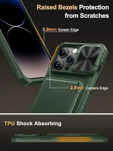 iPhone 14 Pro Max g'ilofi, hamyon g'ilofi, kartdon, RFID blokirovkasi, suriluvchi kamera himoyasi, harbiy darajadagi himoya, tushishdan himoya, yashil g'ilof, Vihibii, telefon g'ilofi