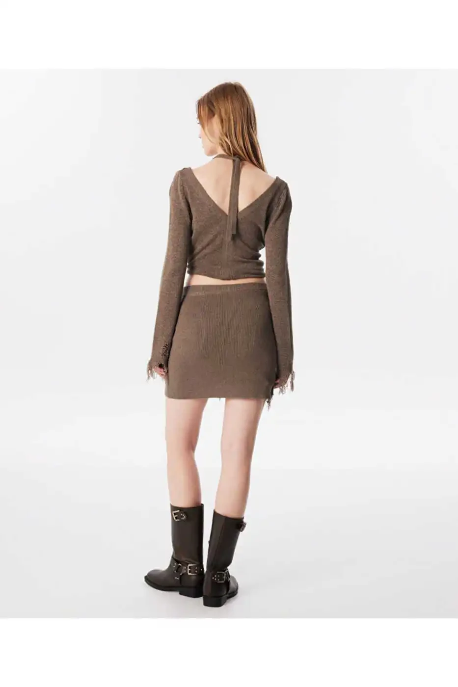 The distressed knit skirt stands out for its adaptability to different combinations. You can achieve a casual look with T-shirts, blouses or shirts. For a more elegant look, you can choose heels and a blazer jacket with the skirt.