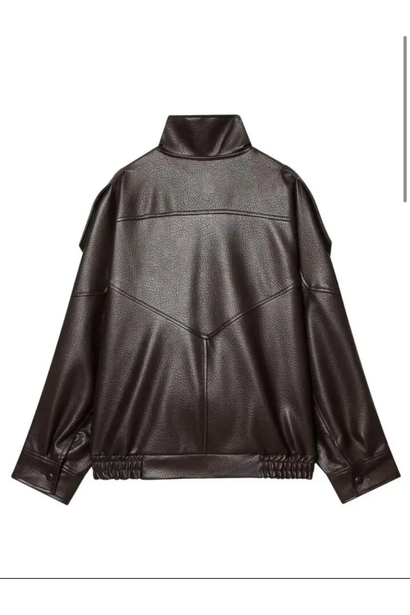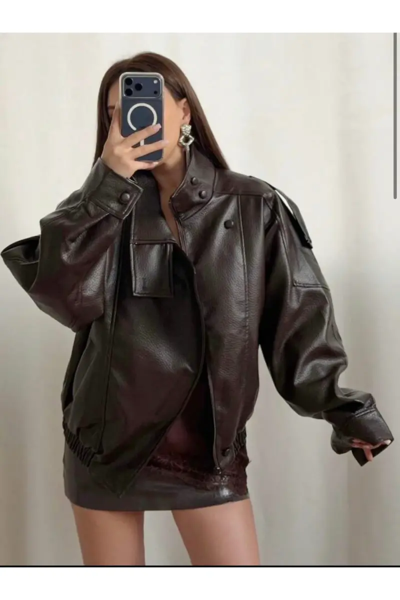 Viral Oversize Kadın Deri Ceket Yüksek Yaka Siyah Urban Style Kadın Deri Ceket-Acı Kahve