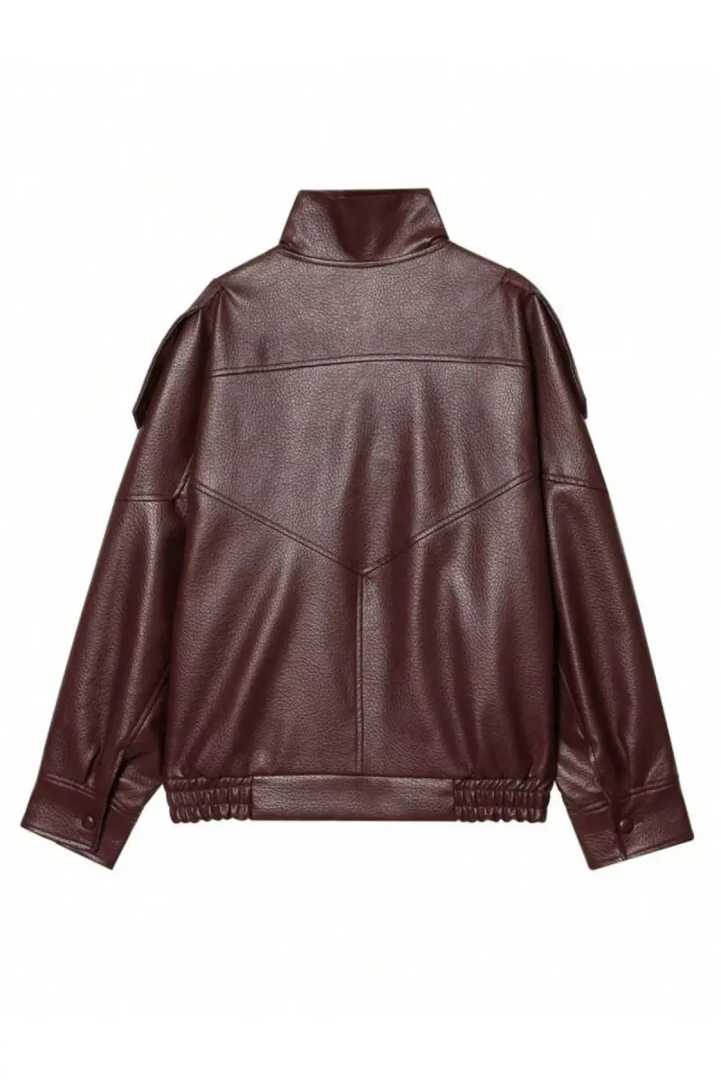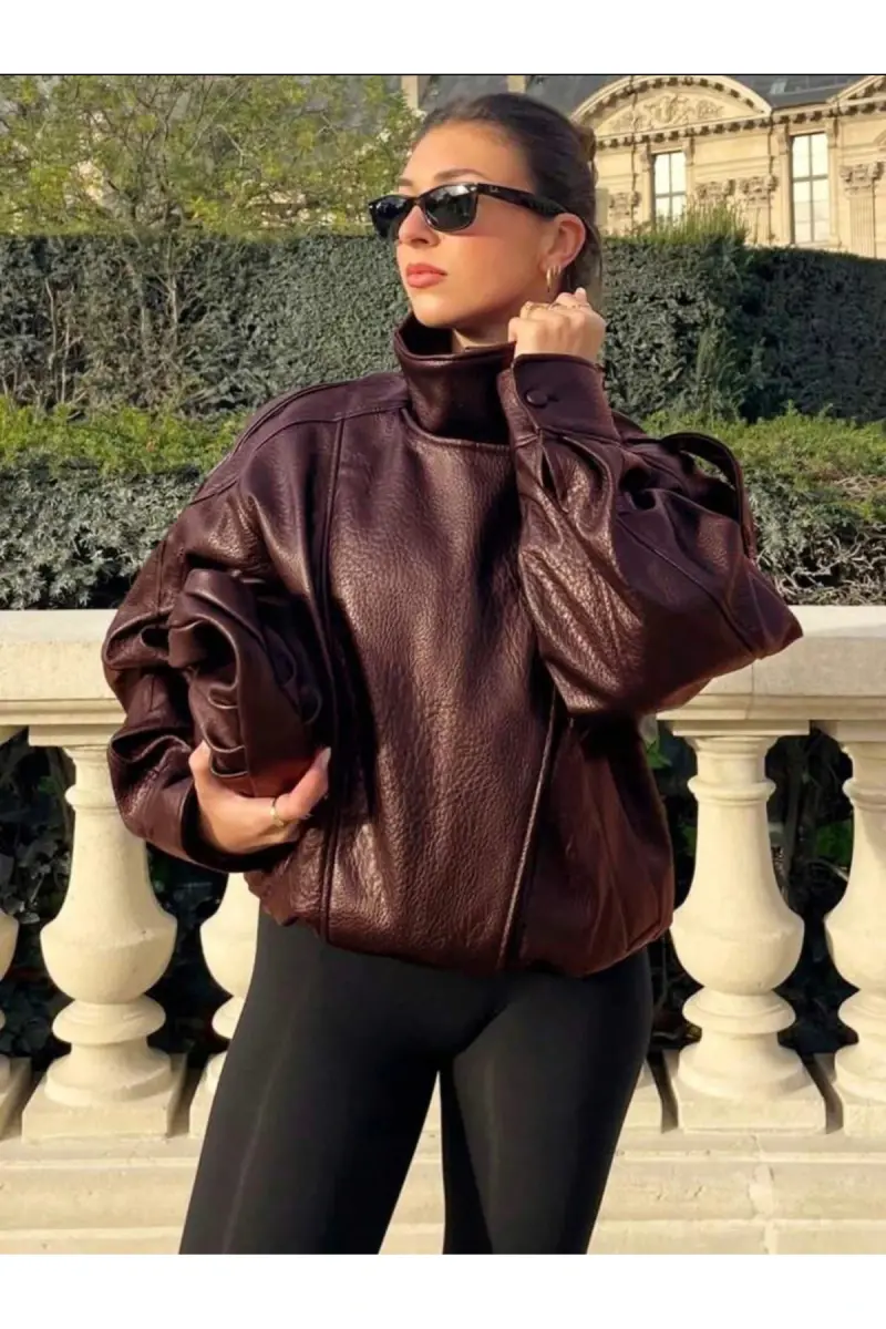 Viral Oversize Kadın Deri Ceket Yüksek Yaka Siyah Urban Style Kadın Deri Ceket-Bordo&Burgundy