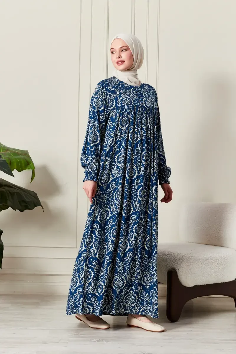 The Ruffled Smock Front Buttoned Viscose Fabric Islamic Clothing Mother Dress Prayer Dress offers both a stylish and comfortable option with its ethnic patterned blue design. This special design will accompany you on both daily use and special occasions. The dress's 100% cotton fabric provides all-day comfort while allowing your skin to breathe. Thanks to its non-see-through structure, you can feel safe during the day. Its ability to be worn in every season ensures it becomes an indispensable part of your wardrobe. The basic silhouette can be easily combined with different accessories and allows you to reflect every style. The beltless design offers a modern and minimalist look, while the crew neck creates a simple and elegant style. The terry viscose weave leaves a soft and smooth feeling, allowing you to be comfortable all day long.Designed specifically for the Islamic clothing collection, this dress perfectly balances elegance and the need for covering. The long length cut makes your legs look longer and helps you to display an elegant stance. The regular fit option adapts to your body lines while not restricting your freedom of movement. The knitted fabric type offers flexibility, accompanying you in all your activities during the day. You can easily prefer this dress in daily environments, and it is an ideal piece that you can carry with you from work to shopping. Thanks to its viscose material, it is breathable and ideal for summer months, but it can also be used in cold weather. The long sleeve length is protective regardless of seasonal changes and completely protects you from the cold. With its long sleeve type, it completely covers your arms, showing compliance with Islamic clothing principles. With its floral pattern, it helps you create an eye-catching style by highlighting feminine details. Thanks to its buttoned details, it offers practical use while also providing an aesthetic appearance. The pocketless design emphasizes minimalism while having modern lines. Its TR origin guarantees compliance with local production standards while also indicating that it has passed quality control. This dress appeals to the fashion-forward persona and manages to take its place in the wardrobe of women who follow trends. Whether you use it as a prayer dress or complete your daily elegance, this dress will accompany you in every situation.
