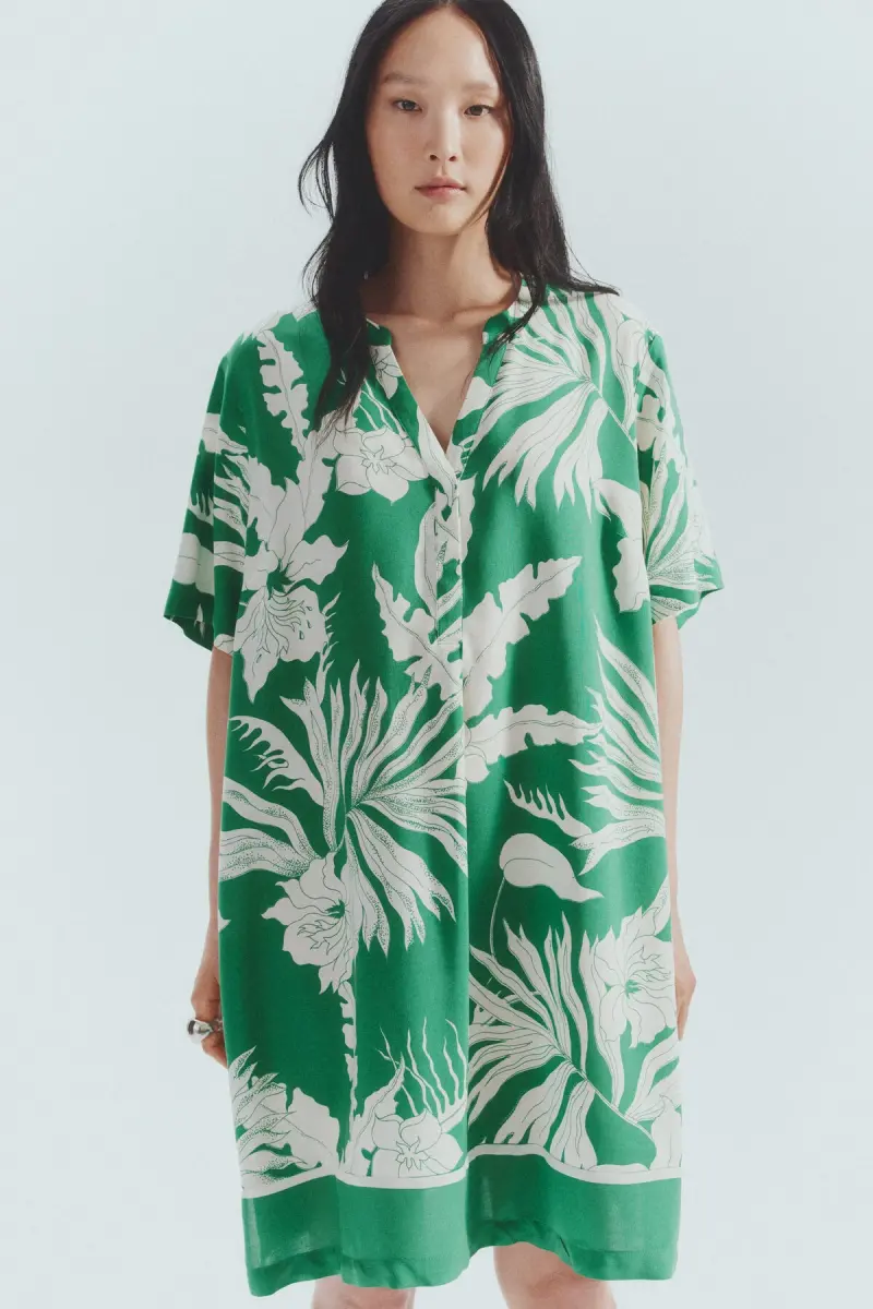 Viskoz Tunik Elbise-Yeşil/Beyaz çiçekli