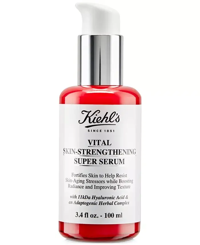 Vital Skin-Strengthening Hyaluronic Acid Super Serum features a superior formulation that strengthens your skin, protects it against external factors, and visibly reduces the signs of aging. Thanks to the adaptogen plant complex it contains, it adds radiance to your skin and increases your resistance to environmental stress factors. This special serum is suitable for all skin types, including normal, dry, oily, combination, and sensitive skin types. It strengthens your skin and protects it against factors that cause skin aging, such as UV rays, pollution, extreme temperatures, tobacco use, stress, insomnia, and poor nutrition. These factors can lead to dullness, dehydration, fine lines, and other signs of aging on the skin. Vital Skin-Strengthening Hyaluronic Acid Super Serum strengthens your skin against these negative effects, helping it look healthier and younger. The 11kDa Hyaluronic Acid in the serum penetrates the deepest layers of the skin, increasing the moisture level, filling in fine lines, and visibly improving skin texture. 11kDa, Kiehl's smallest molecular size hyaluronic acid, provides moisture to the skin's most vulnerable layer, helping to improve moisture retention, increase elasticity, and provide a visible plumpness to the skin. Adaptogen Plant Complex is a special blend of adaptogens (red ginseng root, holy basil, and schisandra grape) traditionally used in Chinese, Korean, and Ayurvedic medicine. In Kiehl's formula, adaptogens work synergistically to protect the skin from stressors while renewing skin texture and providing a smooth, radiant appearance. Create a noticeable difference in your skin with Vital Skin-Strengthening Hyaluronic Acid Super Serum. Apply to cleansed face and neck in the morning and evening, then use your daily moisturizer. You can also apply it under another serum if desired. Avoid contact with eyes; in case of contact, rinse with plenty of water. For best results, use the serum with Kiehl's Clearly Corrective Dark Spot Solution and Ultra Facial Cream. With clinically proven results, it doubles your skin's strength and visibly reduces fine lines, smoothes skin texture, and increases skin's radiance for a healthy-looking glow. Give your skin the care it deserves and protect your youth with Vital Skin-Strengthening Hyaluronic Acid Super Serum.