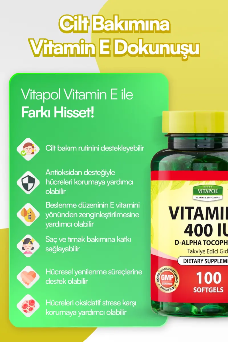 Yurdavit Витамин E 268 мг 100 капсул 400 единиц, благодаря своим мощным антиоксидантным свойствам, помогает защитить ваши клетки от свободных радикалов и сохранить их здоровье. Витамин E играет важную роль в поддержании здоровья вашей кожи, волос и иммунитета. Он также оказывает положительное влияние на здоровье сердечно-сосудистой системы.