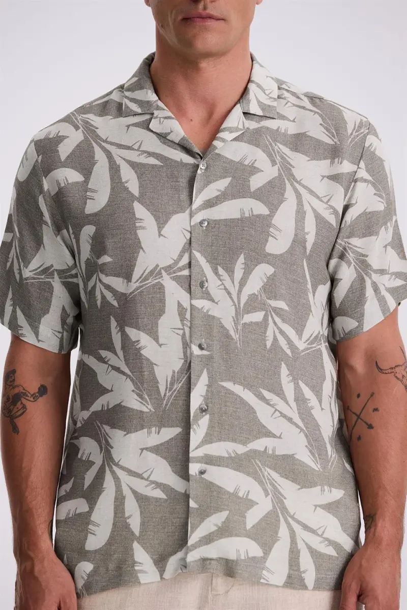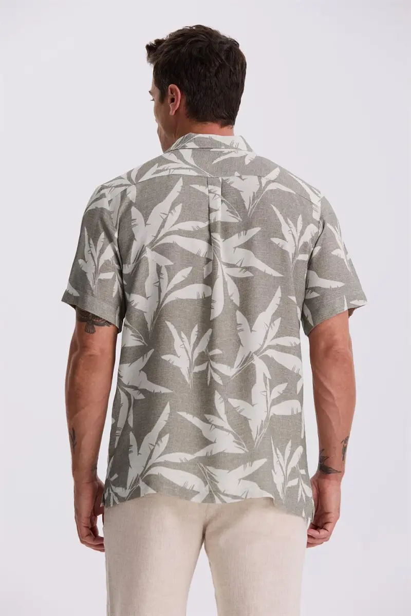 Vizon Klasik Fit Apaş Yaka Desenli Rahat Kalıp Keten Karışımlı Kısa Kollu Gömlek