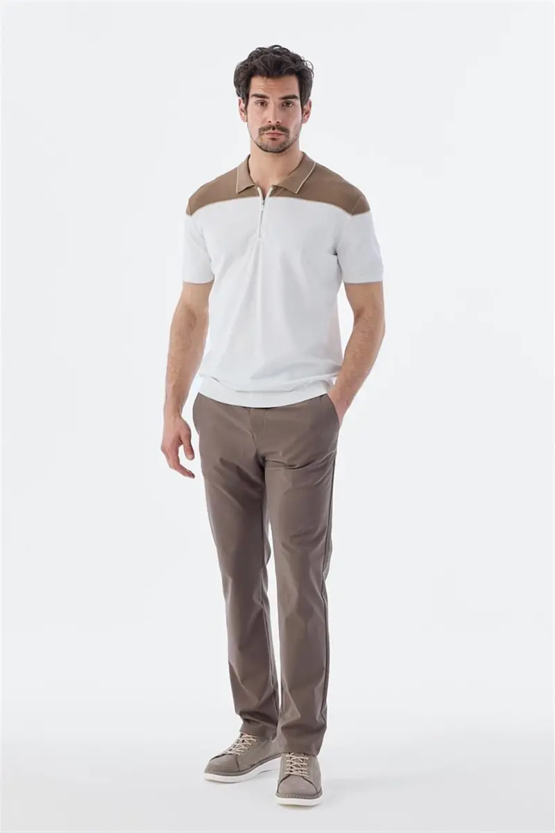 Vizon tişört, slim fit, fermuarlı polo yaka, erkek giyim, pamuklu tişört, modern erkek, şık tişört, rahat tişört, vizon renk, polo yaka tişört