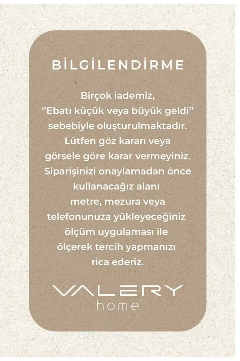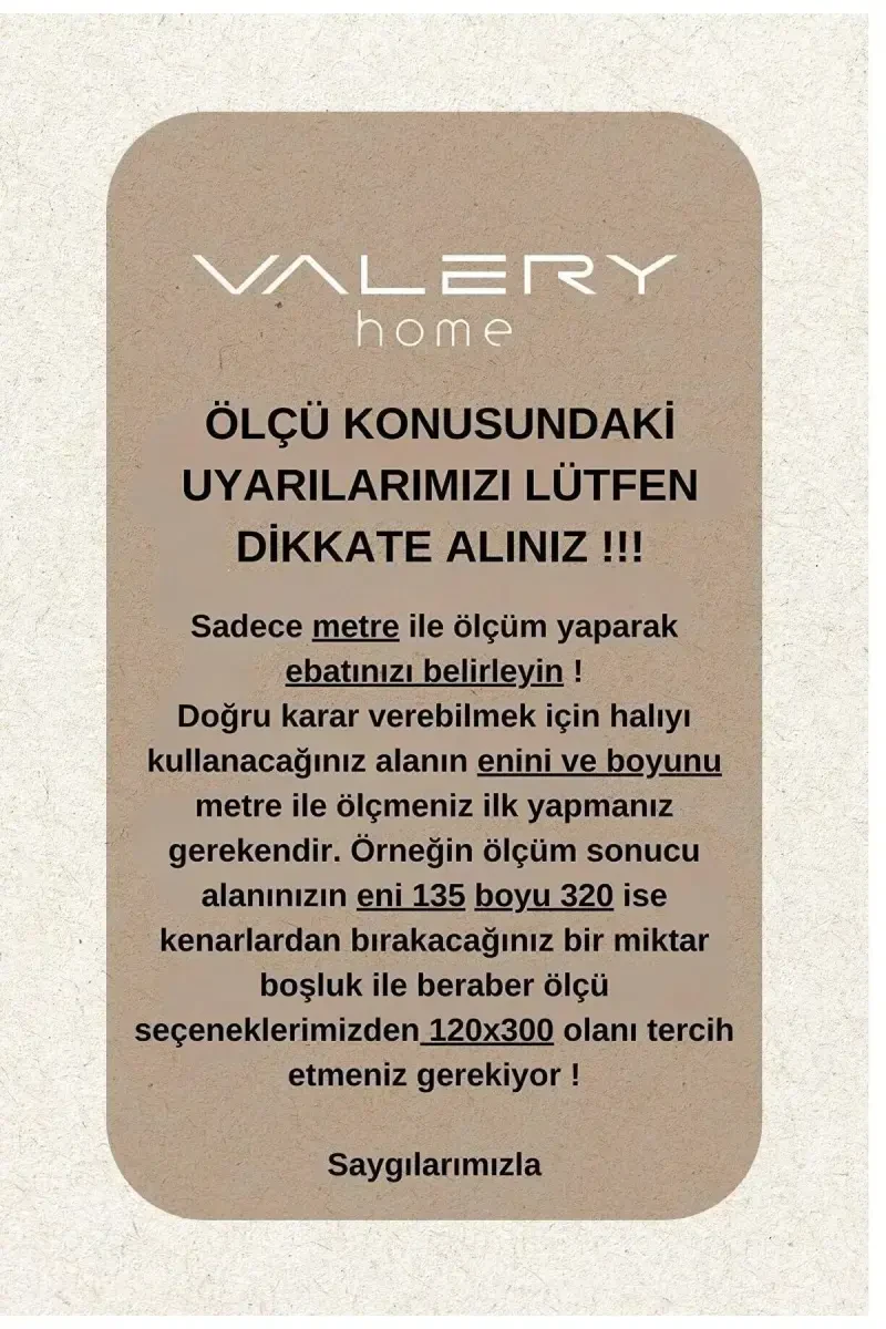 Bu ürün Valery Home tarafından gönderilmektedir. Kampanya fiyatından satılmak üzere sınırlı sayıda stokta bulunmaktadır. Bir ürün birden fazla satıcı tarafından satılabilir. Birden fazla satıcı tarafından satışa sunulan ürünlerin satıcıları, ürün için belirledikleri fiyata, satıcı puanlarına, teslimat statülerine, ürünlerdeki promosyonlara, kargonun bedava olup olmamasına ve ürünlerin hızlı teslimat ile teslim edilip edilememesine, ürünlerin stok ve kategorileri bilgilerine göre sıralanmaktadır. Bu üründen en fazla 10 adet sipariş verilebilir. 10 adedin üzerindeki siparişleri Trendyol iptal etme hakkını saklı tutar. Belirlenen bu limit kurumsal siparişlerde geçerli olmayıp, kurumsal siparişler için farklı limitler belirlenebilmektedir. 15 gün içinde ücretsiz iade imkanı bulunmaktadır. 30 derecede makinede sıkma yapmadan veya elde yıkanabilir. Oturma odası, salon, mutfak, yatak odası, çocuk odası, antre ve koridor gibi farklı alanlarda kullanılabilir. Ayrıca kesme yolluk, kesme halı, peluş halı, jel halı, yuvarlak halı, İskandinav halı ve beyaz halı olarak da tercih edilebilir.