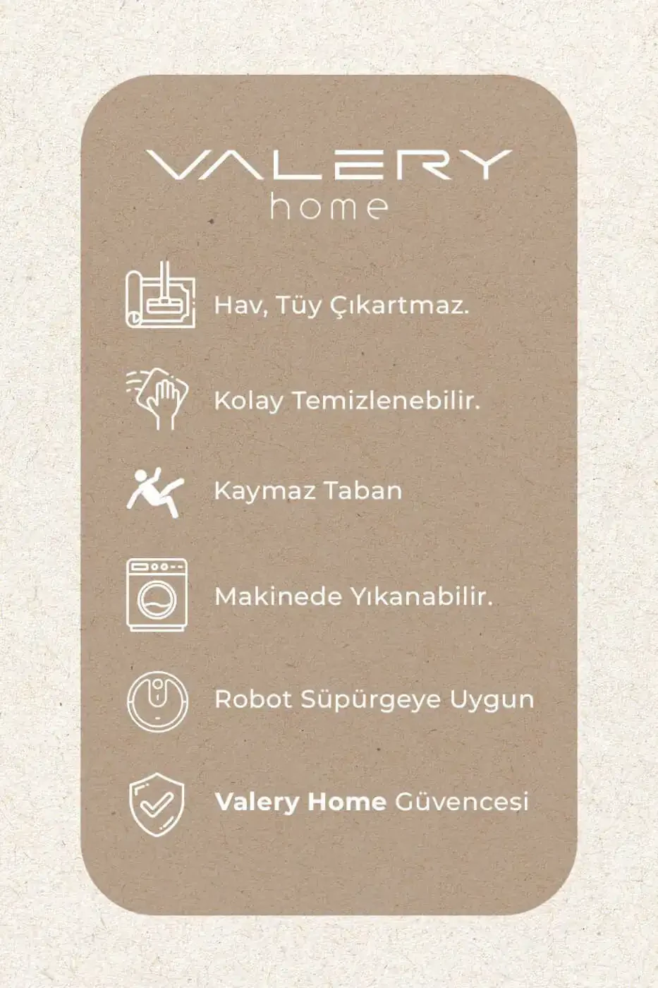 Vl Ювиладиган Сийдам Асос Пўст Плюш Ҳаммом Тахтачаси Учлиқ Жамланмаси кул ранг билан ҳаммомларингизни замонавийлик ва қулайлик билан уйғунлаштиринг! Бу учлиқ жамланма, юмшоқ плюш тўқимаси билан оёқларингизнинг ҳар бир тегишида енгиллатувчи тажрибани тақдим этади. Сийдам гель асоси туфайли хавфсиз ва ишончли фойдаланишни таъминлайди, ювиладиган хусусияти билан гигиеник ҳаммом муҳитини яратишга ёрдам беради. Кул ранг билан ҳар қандай ҳаммом декорларига мос келадиган бу замонавий тахтача жамланмаси, кундалик ҳаётингизда амалийлик ва қулайликни бирлаштириб беради. Устун сифатли материаллардан тайёрланган Vl Ювиладиган Сийдам Асос Пўст Плюш Ҳаммом Тахтачаси Учлиқ Жамланмаси кул ранг, узоқ муддатли фойдаланиш учун мўлжалланган. Пўст ва юмшоқ тузилиши билан, ҳаммомдан чиққанингизда оёқларингизнинг совуқ полга тегишини олдини олади ва сизга илиқ ва қулай ҳисни тақдим этади. Шунингдек, 30 даражада қўлда ёки машинада ювиладиганлиги, тозалигини осонлаштиради. Четлари диққат билан ўрам қилинганлиги сабабли, узоқ муддатли фойдаланишда ҳам деформация ёки эскириш хавфи минималлаштирилади. Уйда қулай ва замонавий муҳит яратишни истаганлар учун идеал танлов бўлган бу маҳсулот, сизга люкс меҳмонхона тажрибасини ўз ҳаммомларингизда яшаш имконини беради. Valery Home кафолати билан тақдим этилган бу маҳсулот, сифат ва мижозлар қониқишига берилган аҳамиятни кўрсатади. Уйингизнинг энг махсус бурчагига замонавийлик ва қулайлик қўшиш учун ҳозироқ буюртма беришингиз мумкин! Захиралар чекланганлиги сабабли, кечикманг!