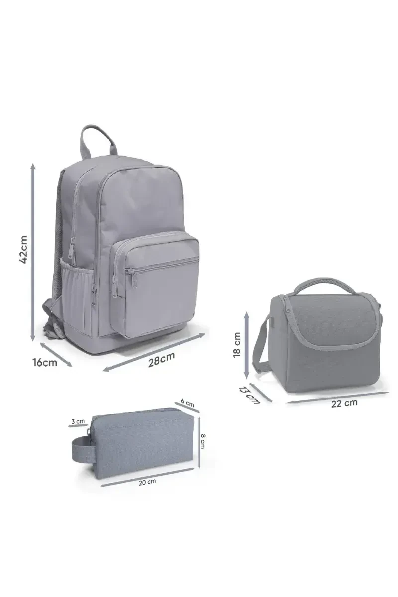 This 3-piece set includes a backpack, pencil case and lunch bag. Bag dimensions: [Bag dimensions can be added here]. Our product is made of high quality materials and is long lasting. Please follow the instructions for use. Different color and pattern options are available. Don't forget to check out our other products!