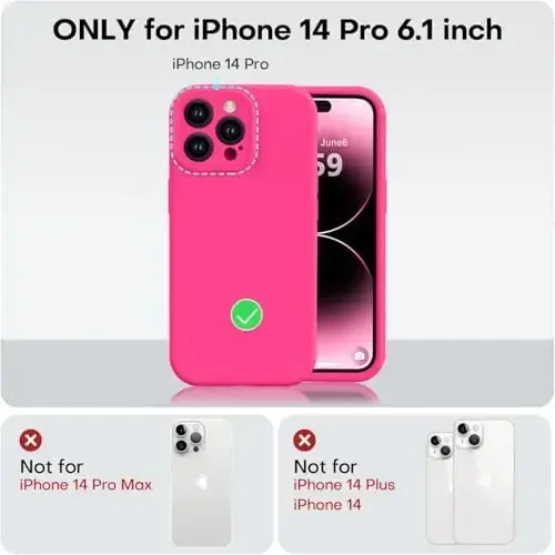 iPhone 14 Pro g'ilofi, suyuq silikon g'ilof, kamera himoyali g'ilof, hot pink g'ilof, zarbani yutuvchi g'ilof, chizilishga chidamli g'ilof, Vooii g'ilofi, silikon g'ilof, telefon g'ilofi, iPhone g'ilofi
