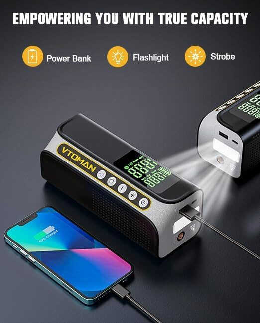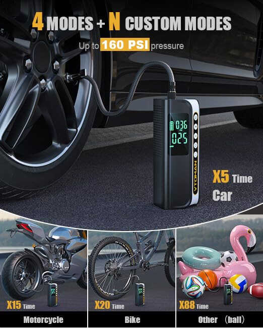 VTOMAN X6 Pro Ko'chma Havo Kompressori, avtomobil shinalari, SUV, mototsikl, velosiped, e-velosiped va to'plar uchun aqlli raqamli bosim o'lchagichi va LED yoritgichi bilan 160PSI avtomatik havo pompasi.