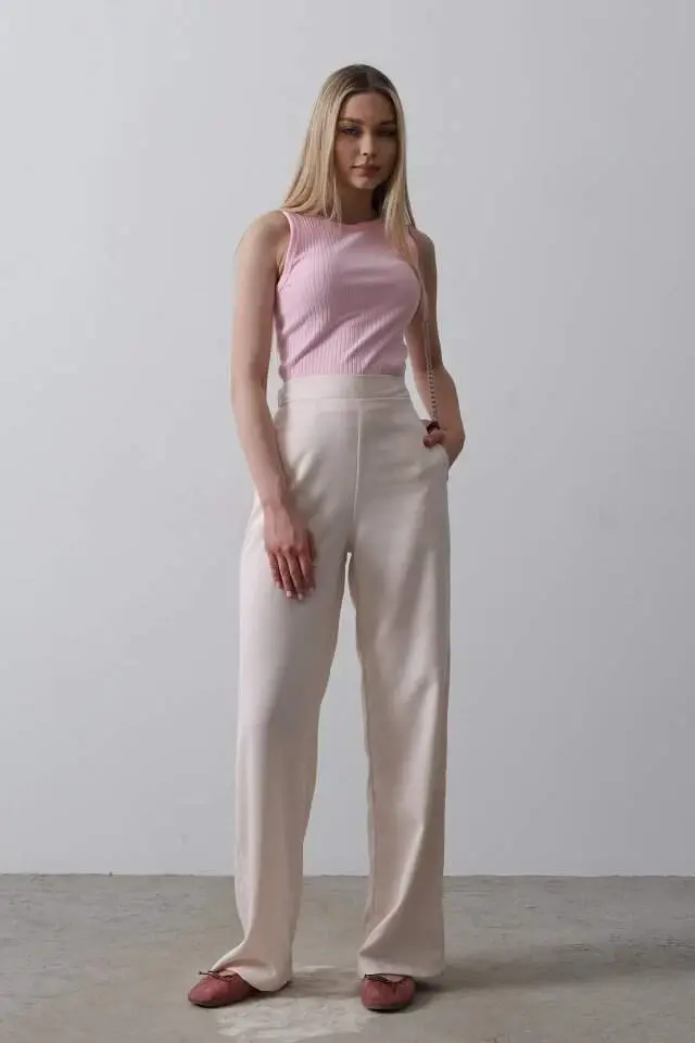 The perfect harmony of elegance and comfort: Palazzo Pants with Half Elastic Waist - Powder! These pants, which will be an indispensable part of your wardrobe, offer both elegance and comfort. You will dazzle in any environment, whether for daily use or a special event. The soft and romantic touch of the powder color will add an elegant touch to any combination. Thanks to the palazzo cut, it allows you to create a stylish silhouette without restricting your freedom of movement. The half-elasticated waist offers comfortable use all day long, while helping you to achieve a pleasant appearance by fitting your body perfectly. The M/38 size on the model is proof of how well these pants can adapt to different body types. These pants, which look great even on a 165 cm tall model, are a must-have in every woman's wardrobe. You can create different styles by combining them with sneakers in your daily combinations or with a stylish blouse and high heels. The quality of its fabric offers long-lasting use, while its easy-to-iron feature saves you time. Enjoy being stylish without sacrificing your comfort with Palazzo Pants with Half Elastic Waist - Powder, and have one of the most loved pieces in your wardrobe. These pants are not just a garment, but also a style statement. It is the perfect choice to reflect your own style and attract attention in any environment. Remember, elegance is hidden in the details, and these pants are ready to add elegance to you with every detail. These pants, which will accompany you both in daily use and on special occasions, will be one of the most valuable pieces of your wardrobe. Feel positive and energetic all day long with the soothing effect of the powder color. Palazzo Pants with Half Elastic Waist - Powder are not just pants, but also a lifestyle. Order now and experience this unique experience!