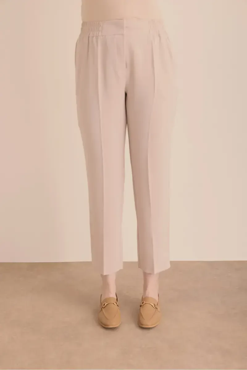 Elastic Waist Detailed Woven Carrot Trousers are an ideal option for women looking for a modern and stylish look. The most distinctive feature of the trousers is their elastic waist. This feature offers comfortable use throughout the day, while also ensuring that the trousers fit the body perfectly. The elastic waistband supports you to be active throughout the day without restricting your freedom of movement. The quality of the woven fabric guarantees the trousers' long life, while also allowing your skin to breathe and preventing sweating. The carrot cut leaves the hip and buttock area comfortable, while the slightly tapered structure towards the legs makes the legs look longer and thinner. This cut offers both comfort and elegance together, adapting to every body type. Beige color represents naturalness and warmth, while also being easily combined with different colors. This color makes the trousers suitable for both day and night use. Whether you achieve a soft look with pastel tones, or create an energetic style with vibrant colors, beige will always be compatible. The details of the trousers add originality to its design. Stitching details, the location of the pockets and other fine details reveal the quality and care of the trousers. These details remove the trousers from ordinariness and add a stylish and sophisticated air. Elastic Waist Detailed Woven Carrot Trousers are not only stylish, but also a versatile piece. It can be easily preferred in the office, in daily life, on travel or at a special event. You can get a more stylish look by combining it with high heels, or create a more comfortable style with sneakers. You can also create different combinations with your accessories and reflect your own style. These trousers will be one of the basic pieces of your wardrobe and will always offer you a stylish and comfortable option. Thanks to the quality of its fabric, the comfort of its cut and the harmony of its color, Elastic Waist Detailed Woven Carrot Trousers are a design that will win the appreciation of every woman. With these trousers, you can highlight both your elegance and your comfort. These trousers, which will make you feel good at any time of the day, are a candidate to be an indispensable part of your wardrobe.