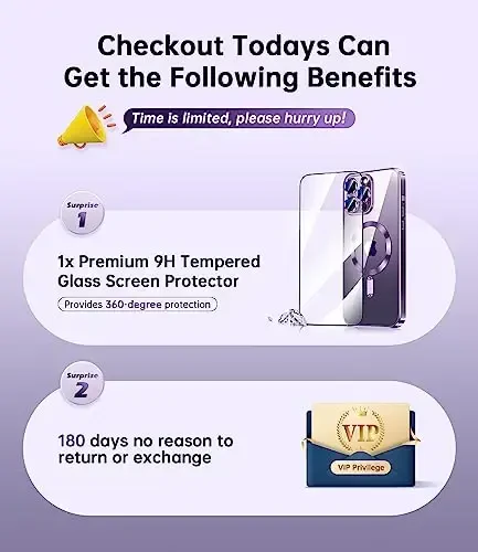 The Waldeng for iPhone 14 Pro Max case offers a perfect combination of protection and style for your iPhone with its integrated camera lens protector and MagSafe compatibility. Its crystal-clear design preserves the original beauty of the iPhone 14 Pro Max 6.7" model, while the purple color option adds a distinctive touch to your style. This case stands out with its luxurious metallic glossy bumper. However, this is not a metal case. It is made of high-quality TPU materials, which prevent damage to your phone. The bumper part has enhanced hybrid technology and is coated with a special electroplating on soft TPU. This perfectly mimics the appearance of the stainless steel edges of the iPhone by 100% and never fades. It perfectly showcases the stylish design of your new iPhone. Waldeng lens protectors are manufactured using advanced 9H glass and diamond-quality high-density compression layer technology. This fully protects your camera lens while maintaining the highest level of image quality. The raised bezels around the screen and camera are 2.5mm (2 times higher than others) and 1.2mm high, respectively. This protects the screen and camera surfaces from scratches and significantly extends the life of your phone's valuable camera. This iPhone 14 Pro Max case features aviation-grade magnetic arrays. It aligns perfectly with MagSafe chargers, providing a strong grip experience and faster 20W wireless charging. The built-in 38 N52 magnets provide a strong magnetic force, ensuring that this case adheres firmly to all magnetic accessories such as MagSafe charger, wallet, battery pack, and car mount. Certified to MiL-Grade standard, this iPhone 14 Pro Max case has successfully passed drop tests from a height of 10FT more than 10,000 times. The special 360° Shock-Absorbing Cushions and 4-layer cushioning TPU bumper distribute impact up to 50.16Mpa. In addition, the back of this iPhone 14 Pro Max protective case is made of polycarbonate, the same material used in shields. This ensures that your device is protected from any damage. Only compatible with iPhone 14 Pro Max 6.7". Every detail of our case protects your new iPhone from scratches. Without affecting the daily use of any function, this case supports all 14 Pro Max accessories such as screen protector, Wireless Charging, Qi certified Charger, etc. It provides convenience for your daily use. Contact us for any issues, an exchange is offered with a 180-day manufacturer's warranty.