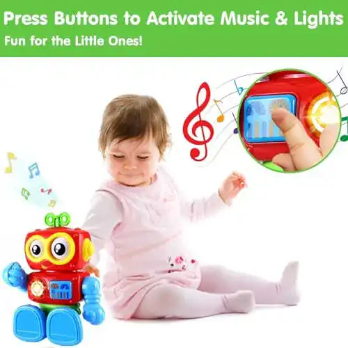 Interactive Toy for Toddlers: The boy can twist the robot's limbs to make a clicking sound. Press the blue button on the robot's chest to activate music and lights. Twist the key on the robot's head and the robot's eyes will move, providing endless opportunities for imaginative play. Safe and Non-toxic: Our robot toys are made with BPA-free plastic and no sharp edges, these toys are safe for babies 12-18 months to play with and explore. The bright colors and robot designs also enhance sensory stimulation and make them great toddler travel toys. Learning Manipulatives for Preschoolers: Our musical baby activity and interactive robot toys feature movable eyes, arms and legs with light and sound to help kids learn how to grasp, hold, twist, pinch, press and more. Let’s baby stay busy and enhance skills like fine motor skills, hand-eye coordination, problem-solving, and concentration. It's designed with sensory learning in mind, inspired by Montessori principles, and can be especially helpful for children with Autism or ADHD. Compact and Travel-Friendly: With dimensions of 6.4 x 5.2 x 2.4 inches, this fine motor skills toys for 1-2 year old is robust and impact-resistant, incredibly convenient for road trips and airplane travel. This sensory toys for toddlers 1-3 will keep your kids engaged and entertained for hours on the go. Ideal Gift Choice: Packaged in attractive packaging, this toy makes a great gift for birthdays, Christmas, Thanksgiving, Easter, travel, and as a teaching aid. Suitable for boys and girls ages 1 2 3 one two three years old. They're an excellent choice for parents looking for educational toys that are also fun and engaging.