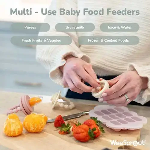 ✅ SET OF 2 SILICONE BABY FOOD FEEDERS - Introduce new foods safely and relieve sore gums with WeeSprout baby food feeders. Fill them with frozen or non-frozen foods – only the tiniest pieces of food make it through the feeder holes! Plus, each set comes with two extra food pouches and two lids to keep your feeders clean until you’re ready to use them. And the interchangeable feeder pieces mean you can use them in solid and two-tone color combinations! ✅ MADE WITH FOOD GRADE SILICONE - Made with food grade silicone, the preferred material for baby food feeders. That means your feeders are sturdy for little teethers but gentle on gums and developing teeth! ✅ DOUBLE AS BABY TEETHERS TO SOOTHE SORE GUMS - This feeder/teether combo is made with soft but sturdy silicone handles that double as teething toys to soothe sore gums. The large easy-grip design allows littles to hold the handles with two hands (and ensures the handle never gets stuck on their wrist!) ✅ SILICONE FREEZER TRAY FOR EASY BATCH PREP - Batch prep multiple portions of breastmilk, water, or puree at once with the included freezer tray (no need to wait for your feeder to freeze before using it again!) Each silicone tray features twelve portion spots and a premium hard plastic lid to prevent spills and freezer burn in the freezer! ✅ EASY TO USE AND CLEAN - Not only are silicone feeders easier to clean and more sanitary than mesh feeders, WeeSprout feeders and trays are also top rack dishwasher safe for quick and easy cleanup!