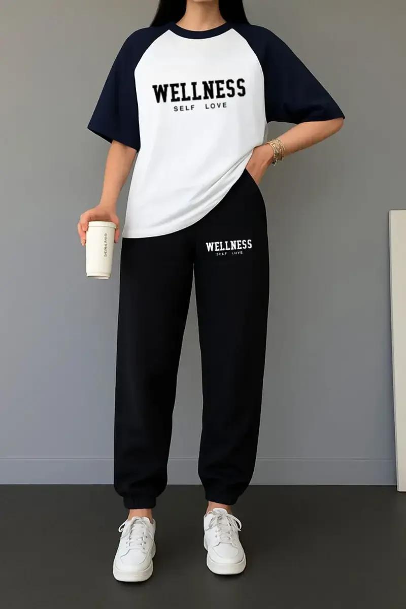 Wellness Printed Raglan Sleeve Navy Blue Oversize T-Shirt and Sweatpants-White/Navy BlueComfort fit, crew neck, short sleeve, printed.Model Measurements: Height: 1.75, Bust: 80, Waist: 60, Hips: 91. Model wears size: S/36/1