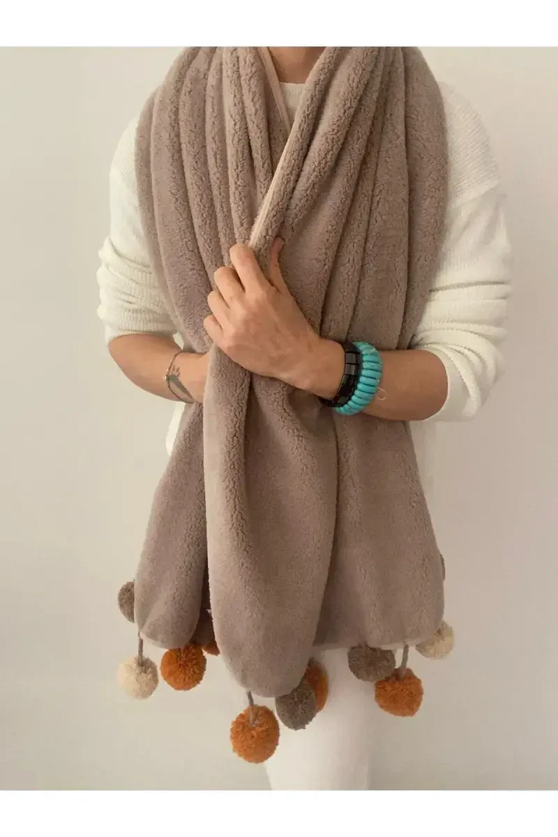 Wellsoft Pom Pom Scarf - Shawl, Stole, Bed Runner - Handmade - Mink Color - Support for Pawed Friends ✨