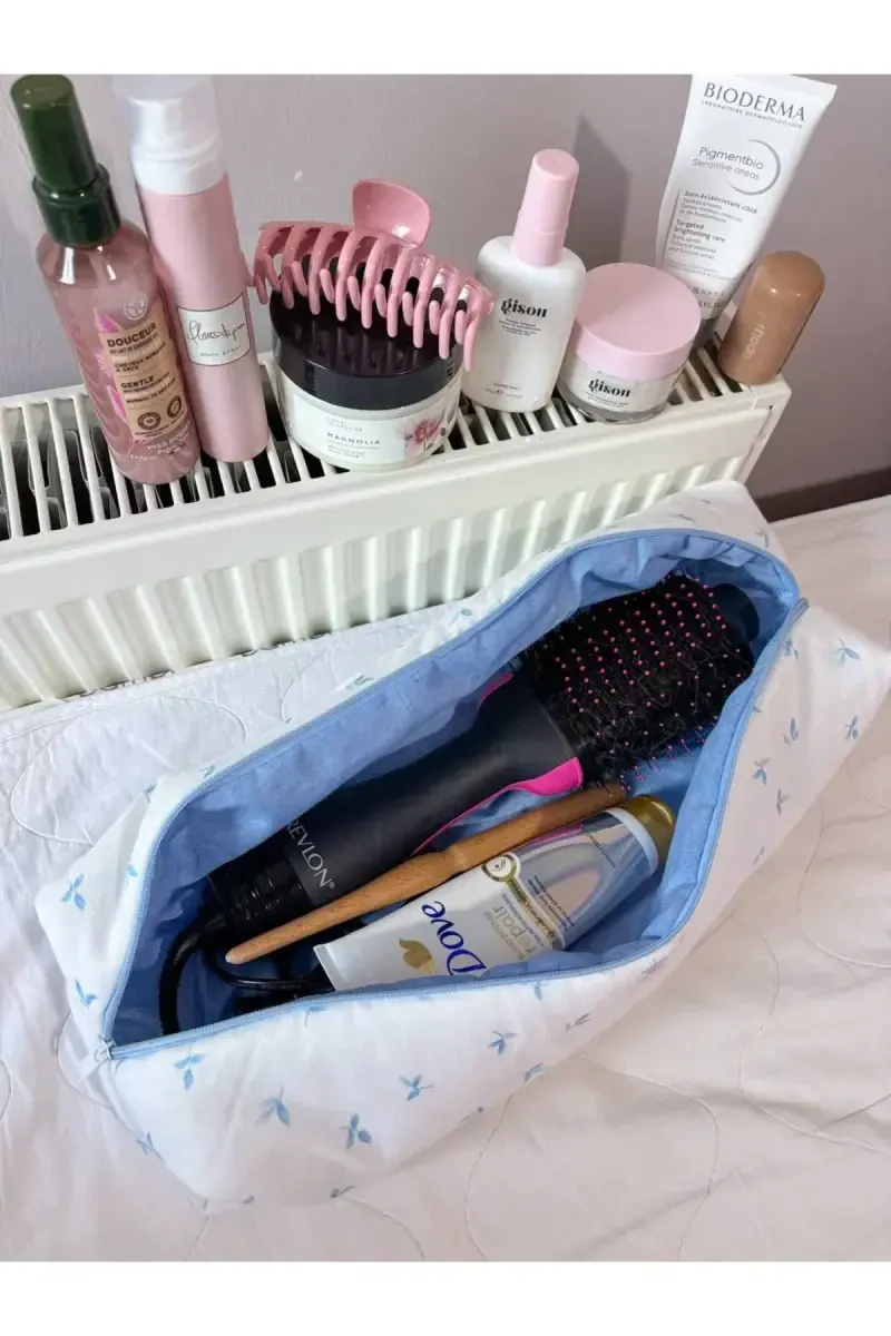The White Blue Floral Hair Curler Straightener Bag is the perfect travel companion for your popular hair styling devices like Airwrap and Airstrait. This stylish and practical bag allows you to carry your hair styling tools safely and organized. The elegant blue floral patterns embroidered on the bag's white background offer an aesthetic appearance and help you reflect your style on your travels. Thanks to its large internal volume, you can easily fit not only your hair curler or straightener, but also your comb, brush, hair care products, and other personal belongings. Made of high-quality material, this bag offers a long-lasting use with its durability. The special compartments and elastic bands inside prevent your devices from being damaged during transportation by fixing them in place. Thanks to its zippered closure, your belongings remain safe and easily accessible. Whether you're on a business trip or a weekend getaway, the White Blue Floral Hair Curler Straightener Bag is the most stylish and practical way to carry your hair styling routine with you. This product, carefully designed by Girlsybags, is produced in limited quantities and is limited to stock. Don't miss this uniquely designed bag and make your travels more enjoyable. Combining elegance and functionality, this bag can also be a great gift option for your loved ones. Ideal for safely storing and transporting your hair styling devices, this bag also allows you to store your makeup materials or other personal care products in an organized manner. The lightweight structure of the bag does not add extra weight to your travels and is easily portable. Enjoy being always well-groomed and stylish without compromising your style with the White Blue Floral Hair Curler Straightener Bag.