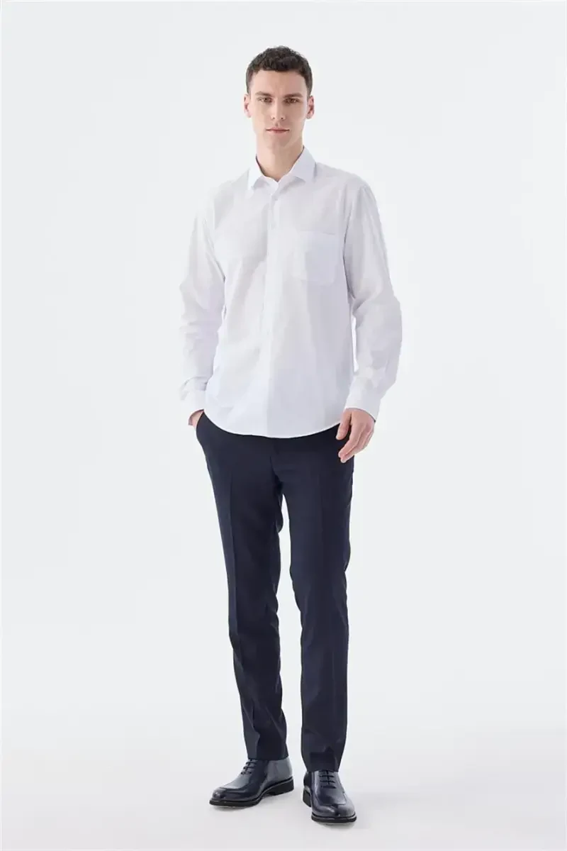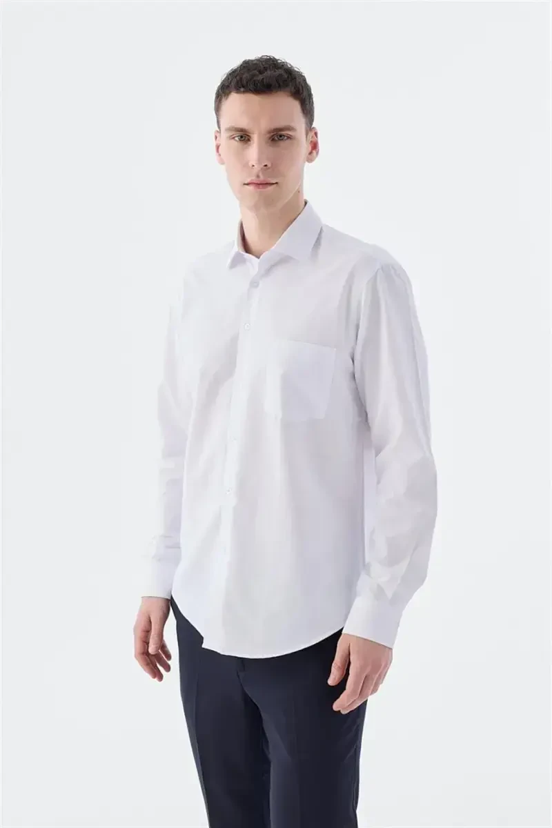 Showcase your best look with our White Classic Fit Italian Collar Long Sleeve Classic Pleat Easy Iron Cotton Shirt, a perfect blend of elegance and sophistication. Made from a 65% cotton and 35% polyester blend, this shirt offers both comfort and durability. The classic Italian collar and pleat detail add a touch of style, while the long sleeves make it suitable for all seasons. The easy-iron feature saves you time. With its perfect fit and classic white color, this shirt will become a staple in your wardrobe, perfectly complementing your suits, blazers, or trousers. From business meetings to special occasions, everyday life to formal settings, it will make you feel stylish and confident, a timeless piece. Made from high-quality materials, this shirt will accompany you for many years and impress you every time you wear it. As you can see in the image on the model, it is specially designed for a perfect fit. Experience this stylish and comfortable shirt and elevate your style. With carefully selected materials and impeccable stitching, you will feel the quality in every detail. Please note that there may be small variations in measurements taken by hand. By following the care instructions on the product label, you can ensure your shirt stays like new for years to come. Order now and upgrade your style!