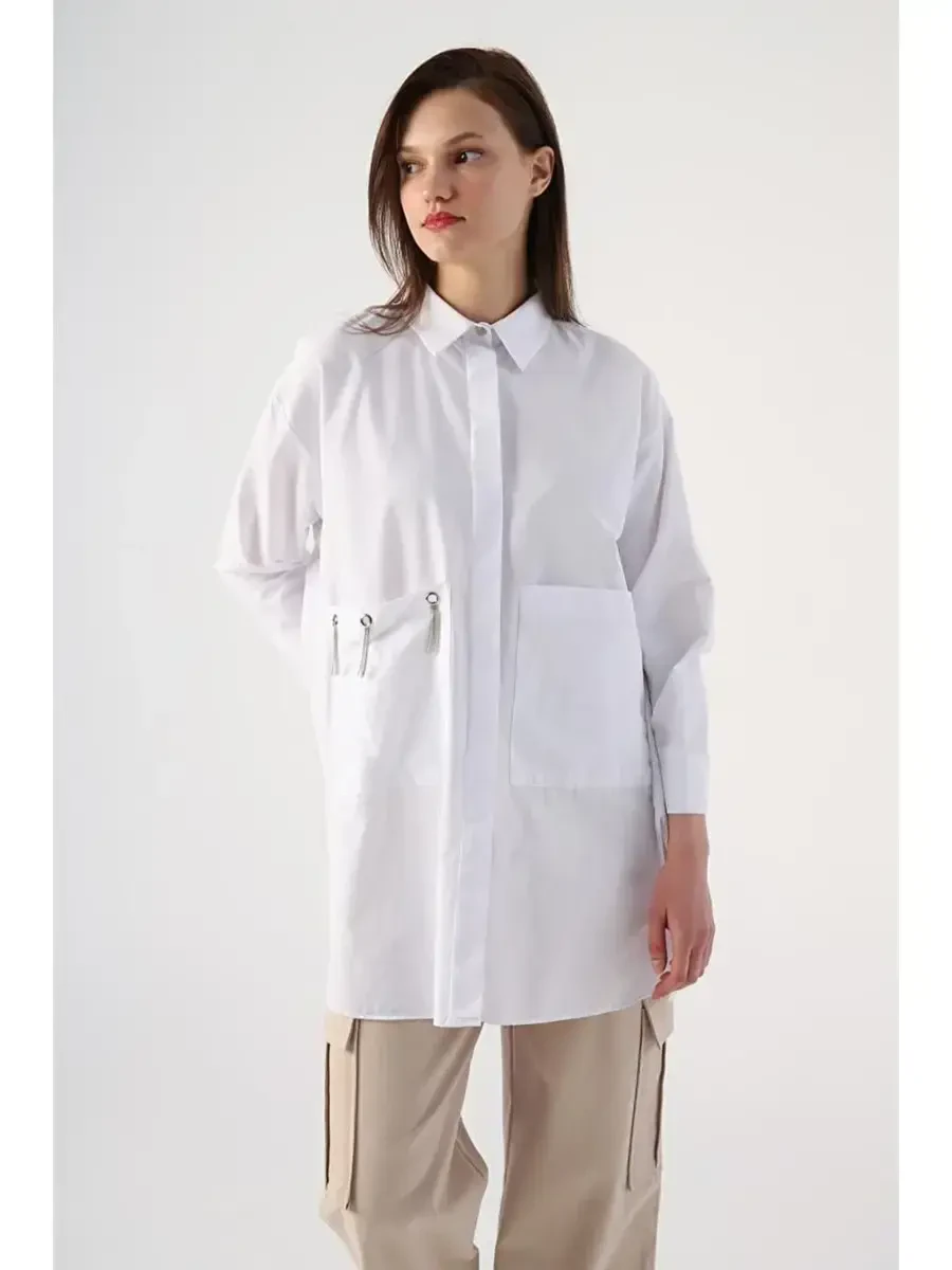 This white oversized shirt combines style and comfort, making it a must-have for your wardrobe! With its large pockets and bird's eye fabric, it helps you create a stylish look for both everyday and special occasions.