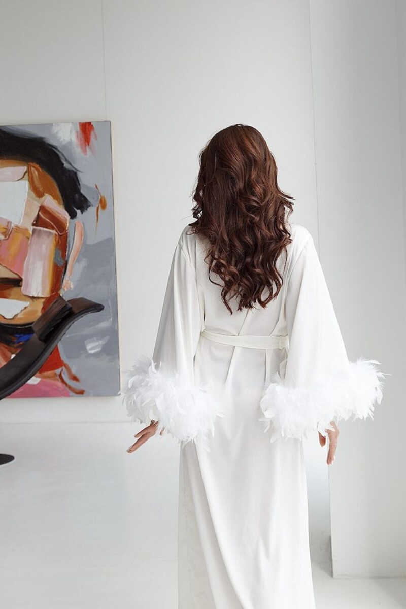 Looking for a stunning bridal robe to make you feel like a princess on your wedding day? Look no further! Made from luxurious white silky satin fabric, this elegant kimono offers a graceful and comfortable look, while its goose down filling will keep you warm and cozy all day long.