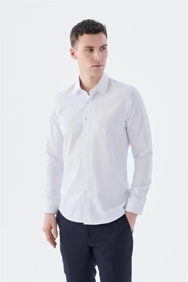 **White Slim Fit Italian Collar Long Sleeve Classic Tie Cotton Shirt**Crafted from a luxurious blend of 65% cotton and 35% polyester, this shirt offers an unmatched softness and quality. Its **slim fit** design contours your body for a flattering and sophisticated look.The **Italian collar** adds a timeless touch, making this shirt suitable for both formal and special occasions. **Long sleeves** provide coverage and comfort in cooler weather, while the **classic tie closure** exudes a professional aura.Enjoy effortless maintenance with the **easy-care fabric**, reducing the need for ironing and saving you time. The durable construction ensures longevity, maintaining its vibrant color and shape even after multiple washes.**Model Measurements:*** Height: 185 cm* Chest: 97 cm* Waist: 81 cm**Model Size:** M