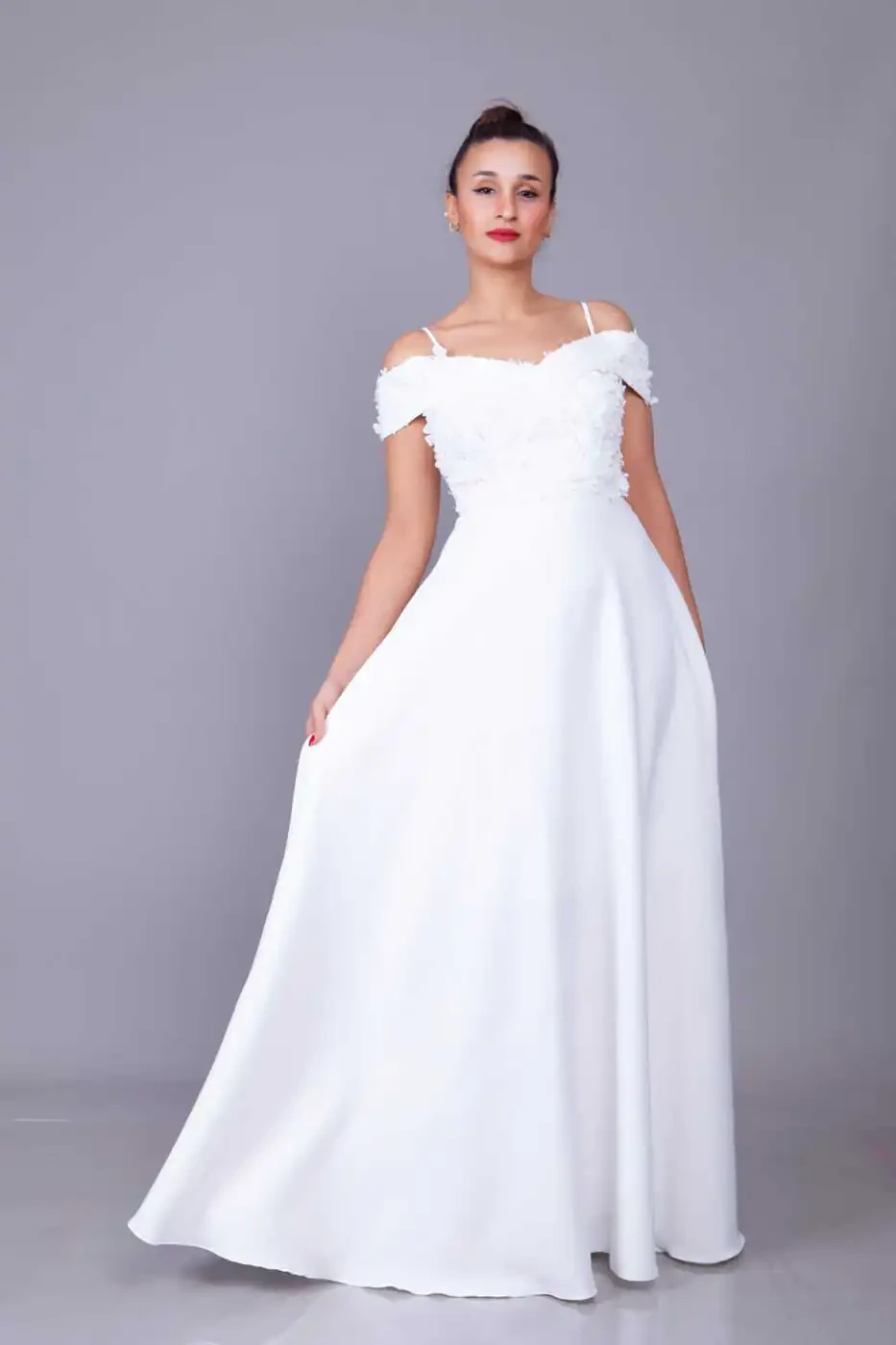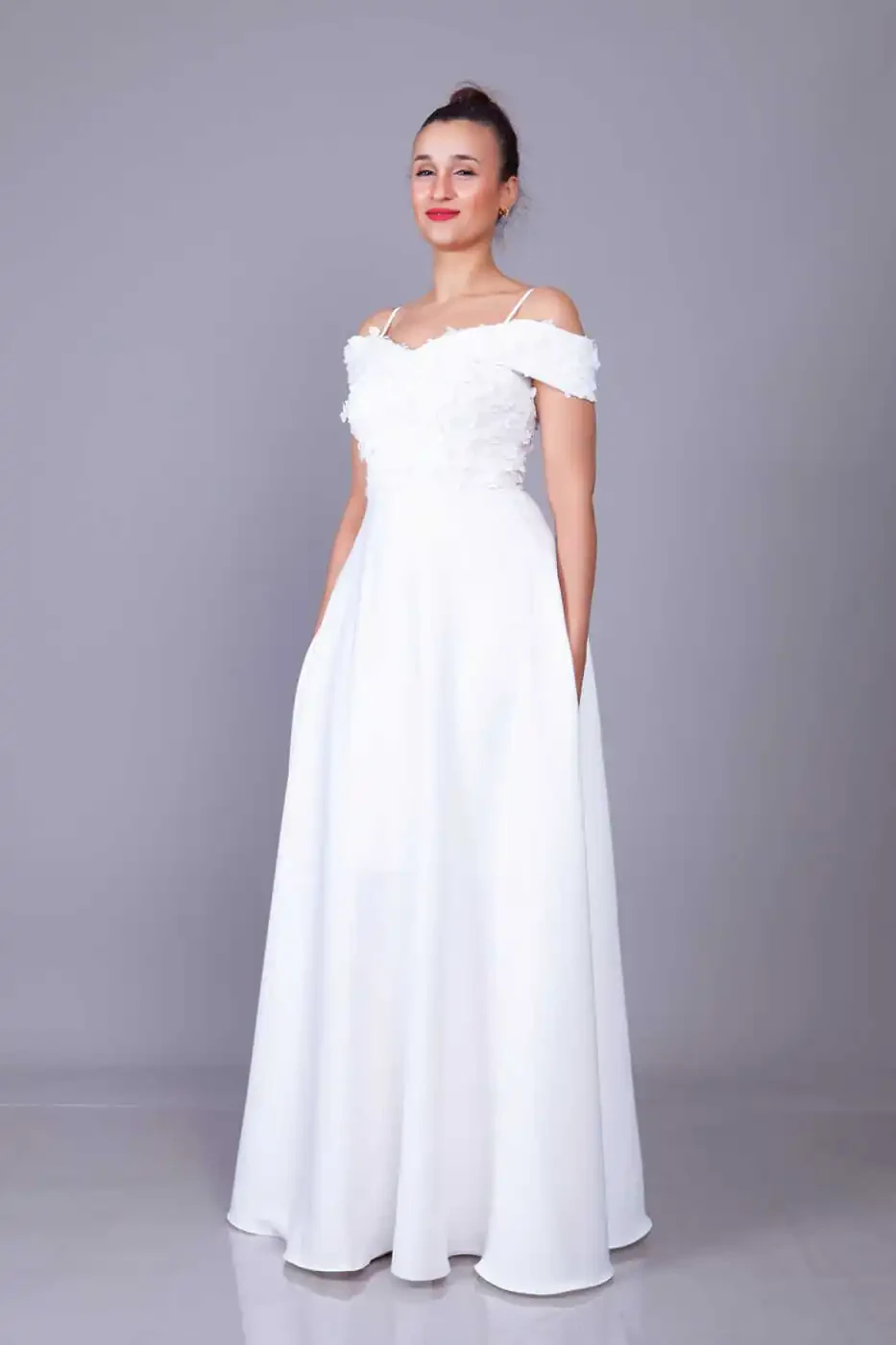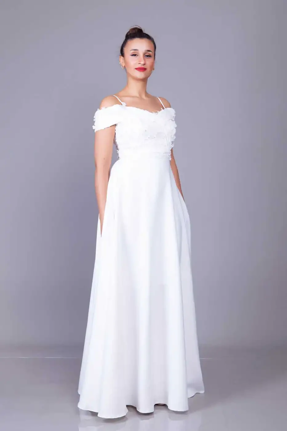 Meet the White Strappy Low Shoulder Floral Tulle Detail Maxi Boy Flared Evening Dress, which will highlight your elegance and grace and will be indispensable for your special days! This enchanting dress was carefully designed and manufactured by Bidoluelbise. This special design, which will make you feel like a princess, dazzles with its low shoulder detail and romantic floral tulle details. The softness and flowing structure of the satin crepe woven fabric perfectly wraps your body and offers comfortable use. The flared skirt cut creates an elegant silhouette without restricting your freedom of movement, while its maxi length gives it an impressive look. The upper body of the product is lined, but there is no lining on the lower skirt. While dark colors do not show through, we recommend wearing a skirt lining inside the product in light color options. This dress, which you can easily choose for both elegant invitations and romantic dinners, will be one of the most special pieces in your wardrobe. Designed with meticulous detail, this dress awaits you to experience unforgettable moments. Our product is our own production and is a piece that you will love to wear for many years with its fabric quality and workmanship. Take advantage of our discounted prices and order now to own one of the limited number of products in our stock! Remember, elegance is with you!
