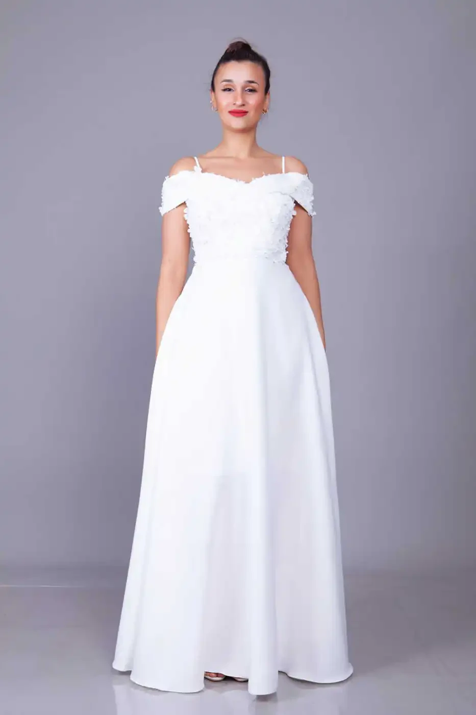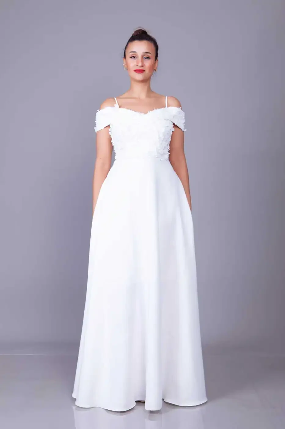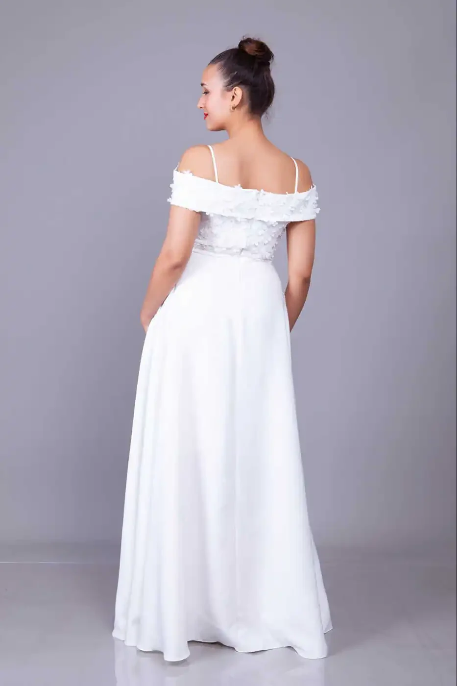 Meet the White Strappy Low Shoulder Floral Tulle Detail Maxi Boy Flared Evening Dress, which will highlight your elegance and grace and will be indispensable for your special days! This enchanting dress was carefully designed and manufactured by Bidoluelbise. This special design, which will make you feel like a princess, dazzles with its low shoulder detail and romantic floral tulle details. The softness and flowing structure of the satin crepe woven fabric perfectly wraps your body and offers comfortable use. The flared skirt cut creates an elegant silhouette without restricting your freedom of movement, while its maxi length gives it an impressive look. The upper body of the product is lined, but there is no lining on the lower skirt. While dark colors do not show through, we recommend wearing a skirt lining inside the product in light color options. This dress, which you can easily choose for both elegant invitations and romantic dinners, will be one of the most special pieces in your wardrobe. Designed with meticulous detail, this dress awaits you to experience unforgettable moments. Our product is our own production and is a piece that you will love to wear for many years with its fabric quality and workmanship. Take advantage of our discounted prices and order now to own one of the limited number of products in our stock! Remember, elegance is with you!