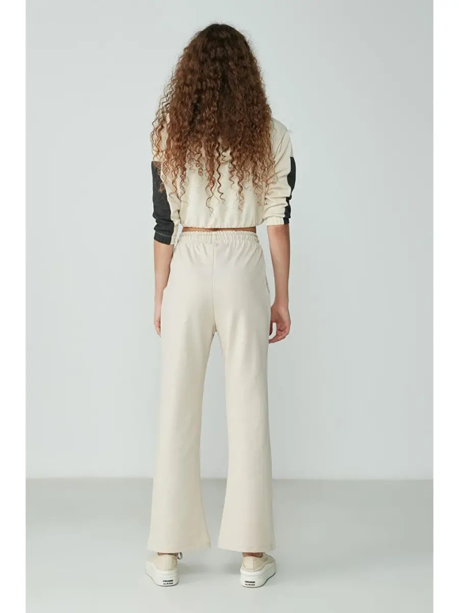 İspanyol Paça Taş Bej Pantolon | Geniş Bacak Lastikli Bel Pamuklu