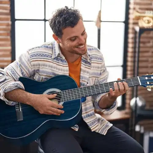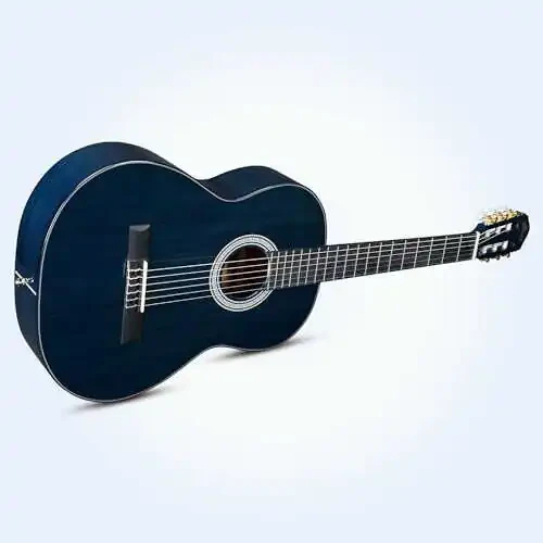 **WINZZ 4/4 Classical Guitar, 39 Inch Full Size Nylon String Guitar for Beginner Adults, Full Classic Guitar Kit with Free Lessons, Gig Bag, Footstool, Capo, Tuner, Hanger and Strap (Glossy Blue)**The WINZZ 4/4 Classical Guitar is an excellent choice for beginners and hobby musicians alike. Its full-size 39-inch body is crafted from quality spruce wood, delivering a rich and resonant sound.The nylon strings are gentle on your fingers, making it easy for beginners to learn and play. With its glossy blue finish and graceful curves, this guitar not only sounds beautiful but also boasts a stylish aesthetic.This classical guitar kit comes complete with a range of accessories to aid your learning and playing experience. The free online lessons provide step-by-step instructions for players of varying skill levels. The gig bag allows you to transport and store your guitar safely, while the footstool ensures a comfortable playing position. The capo enables you to easily transpose chords, and the tuner is ideal for precise tuning. The hanger and strap help you play your guitar comfortably while standing or sitting.**Features:*** Full-size 39-inch body* Quality spruce wood body* Nylon strings* Glossy blue finish* Free online lessons* Gig bag* Footstool* Capo* Tuner* Hanger* StrapEmbark on your musical journey today with the WINZZ 4/4 Classical Guitar and turn your passion into a reality!