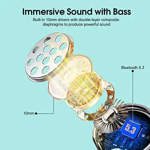 Powerful Sound Quality and Deep Bass: Bluetooth 5.3 technology provides low latency and uninterrupted connection. With HD sound quality, you can listen to your music clearly and powerfully, feeling the deepest bass. Whether you're running, lifting weights, or doing any other sports, music will keep pace with your rhythm.