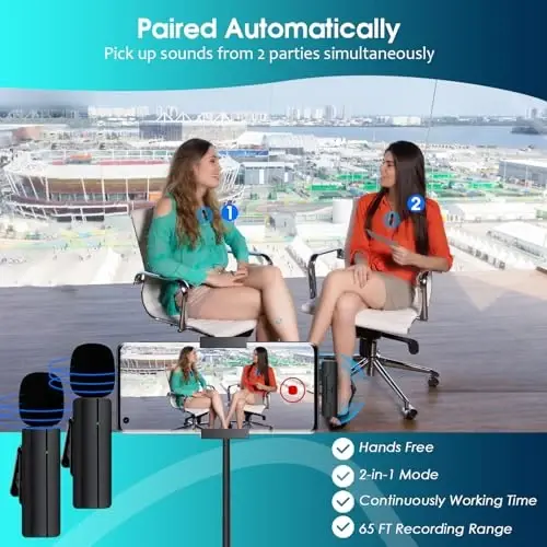 - 1 Receiver and 2 Transmitters: This mini wireless lapel microphone set includes 1 receiver and 2 transmitters, which allows you to record the audio or video of 2 parties at the same time. You can also use a single microphone for interviews, vlogs, live broadcasts, podcasts or online meetings.