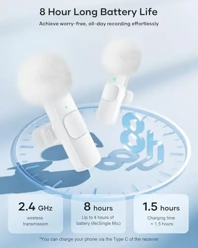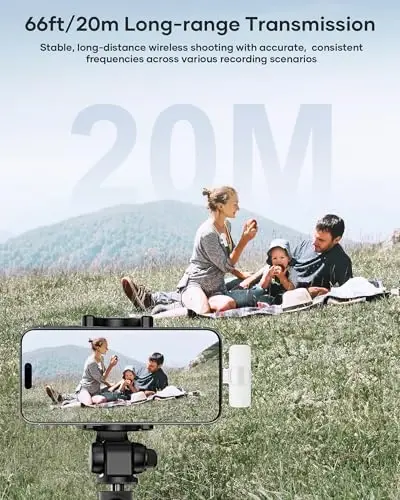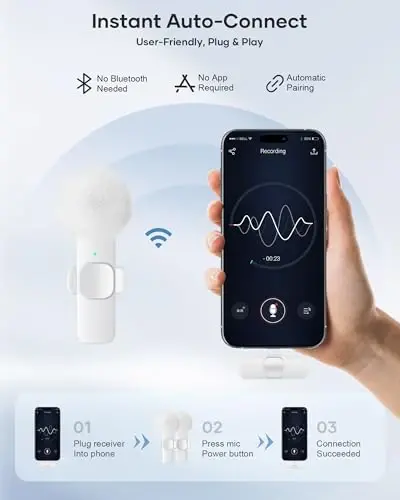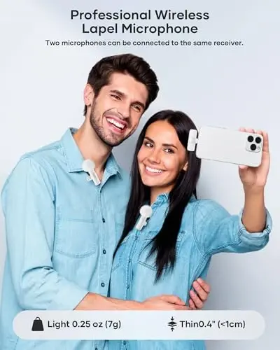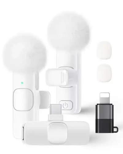 Plug and Play: This professional wireless lapel microphone is easy to use, requiring no Bluetooth or applications. Simply plug the receiver into your phone and turn on the wireless microphones for automatic pairing. The built-in noise reduction chip effectively reduces low-frequency noise while preserving high-frequency vocals, ensuring clear and pure recording quality. Wide Compatibility: The upgraded wireless lapel microphone is compatible for iPhone, iPad, Android phones, and Windows and Mac computers (with iOS port adapter and TYPE-C port). Suitable for various content creation scenarios such as interviews, video recording, online meetings, teaching, podcasts, vlogs, and live streaming. Portable Wireless Mini Microphone: With a compact and portable design, this mini microphone can be handheld or clipped onto clothing. The iPhone-specific microphone provides stable transmission within a range of 66 feet in unobstructed environments. Ideal for influential content creators, TikTokers, and YouTubers, it ensures clear long-distance recording or video shooting both indoors and outdoors. Rechargeable Transmitter and Receiver: The wireless lapel microphone comes with a built-in rechargeable battery, requiring only 1.5 hours of charging time and providing up to 4 hours of working time. The Receiver can also charge your phone while in use, eliminating worries about insufficient battery power. Omnidirectional Sound Pickup: Equipped with high-density windproof foam and a high-sensitivity microphone, it records every sound detail clearly, regardless of the surrounding environment. The package includes 2 lapel microphones, allowing two people to participate in video recording simultaneously.