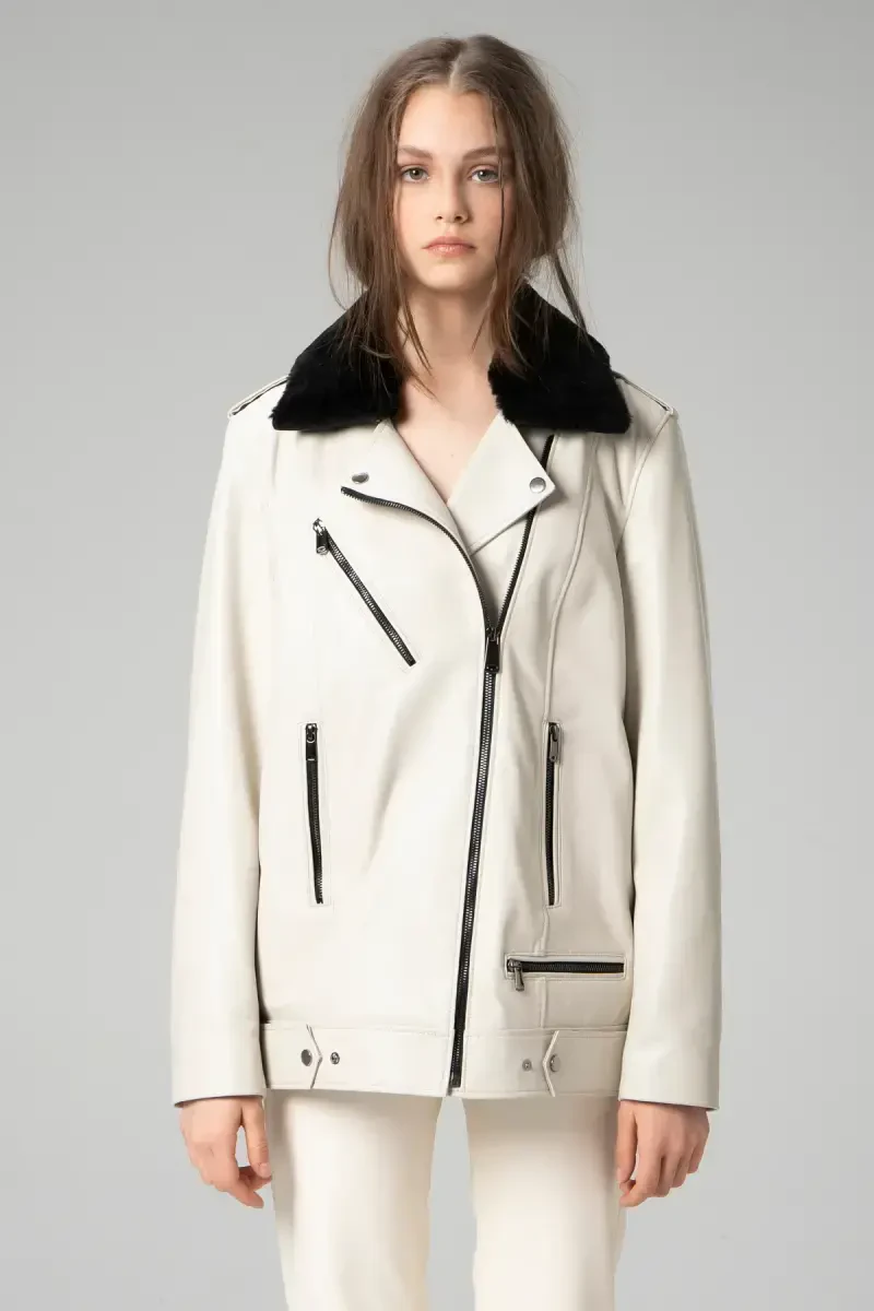 Teri yoqali mo'ynali ayollar kurtkasi - Wm020 Bej | Haqiqiy teri nafisligi