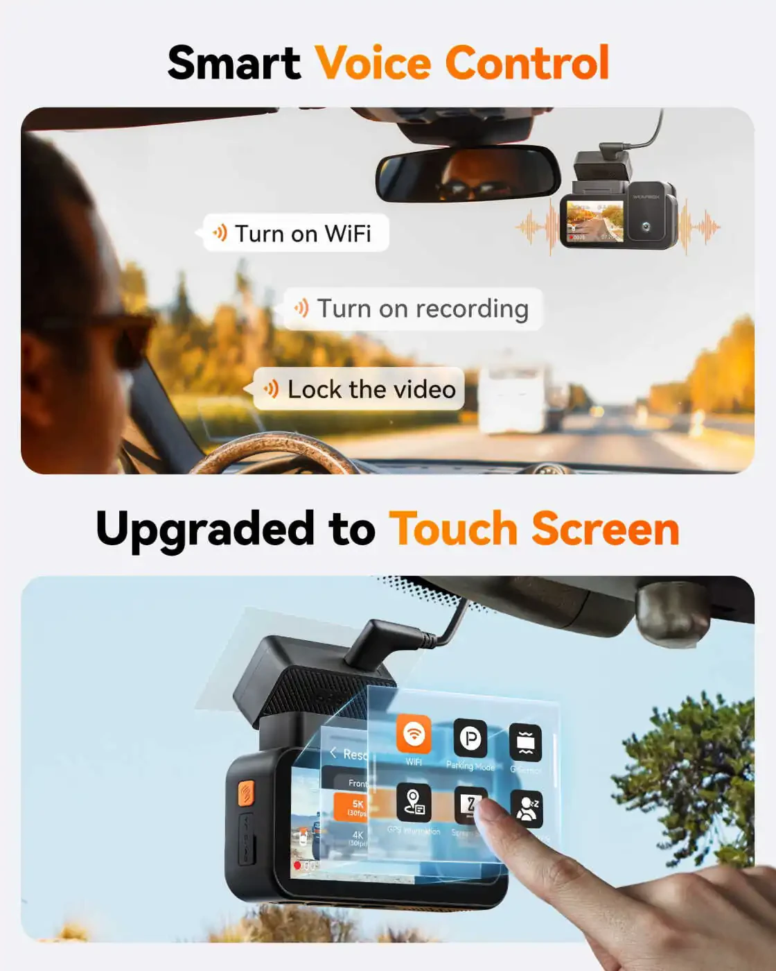 3-Channel Dash Cam, 4K Front Camera, 1080P Inside Camera, 2.5K Rear Camera, Wi-Fi, GPS, Touchscreen, Voice Control, WolfBox X5