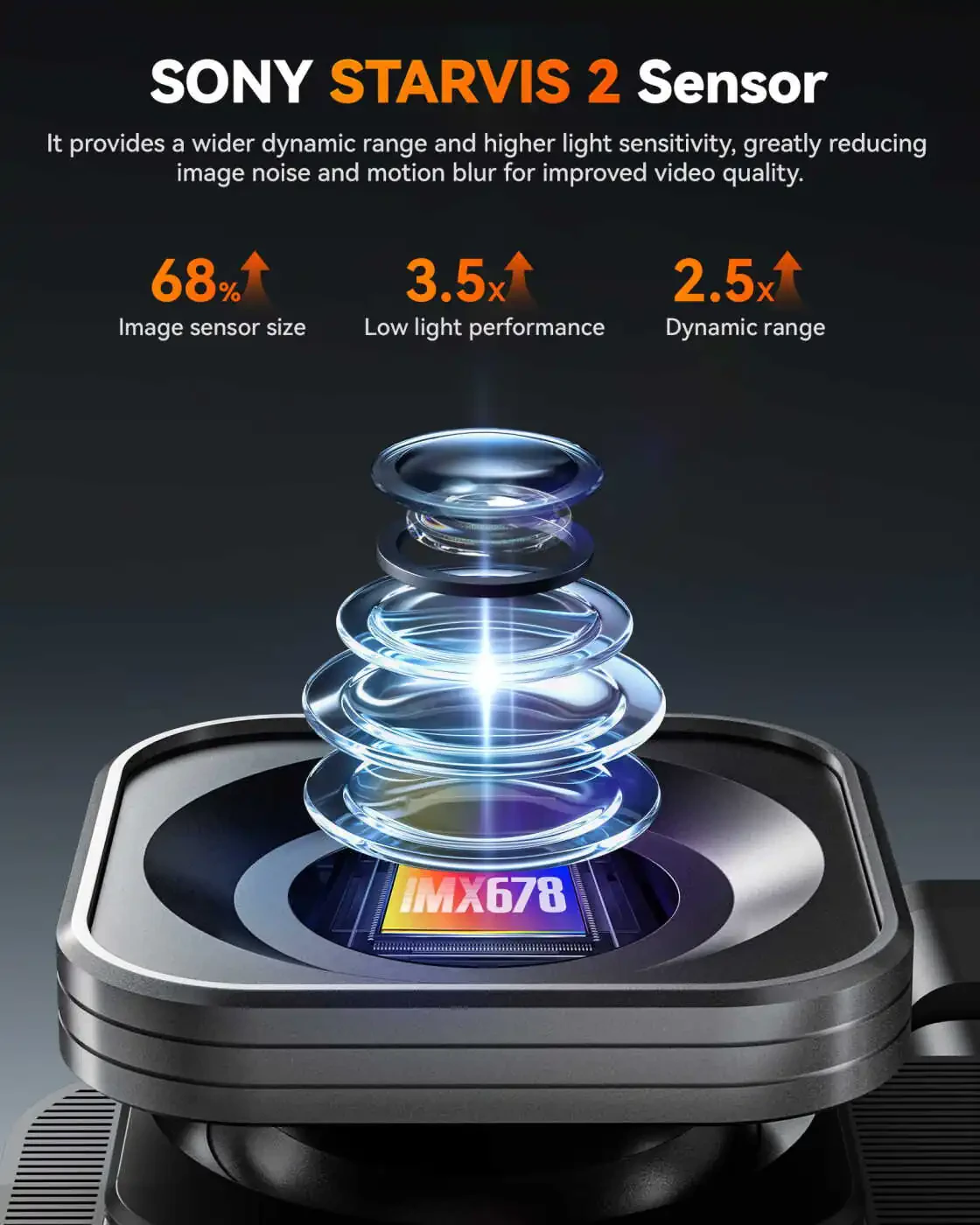 Откройте для себя непревзойденного защитника в пути с 3-канальной автомобильной камерой X5. Эта первоклассная автомобильная система оснащена новейшим датчиком Sony IMX678 STARVIS 2, обеспечивающим потрясающее видео с разрешением 4K спереди, 1080P внутри и 2,5K сзади. Благодаря молниеносному Wi-Fi 5,8 ГГц и точному GPS обмен файлами и навигация становятся проще простого. Элегантный сенсорный экран и система голосового управления с 12 функциями позволяют вам без труда взять все под свой контроль. Будь то циклическая запись, покадровая съемка или режим парковки, X5 обеспечивает непрерывную бдительность. Улучшите свою поездку с помощью автомобильной камеры X5 — надежной защиты вашего пути сегодня и каждый день!
