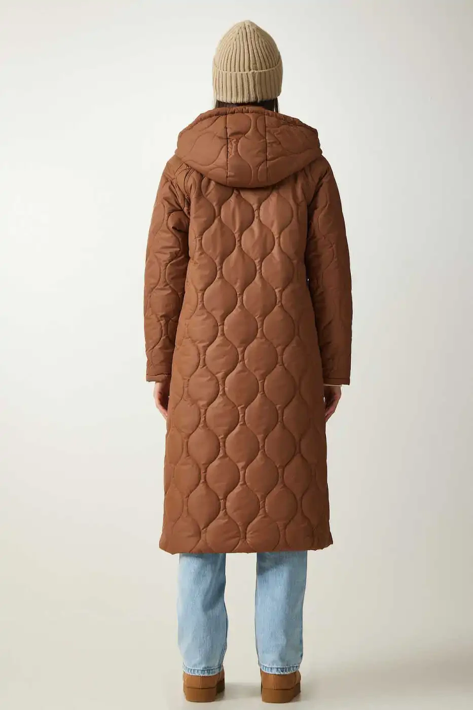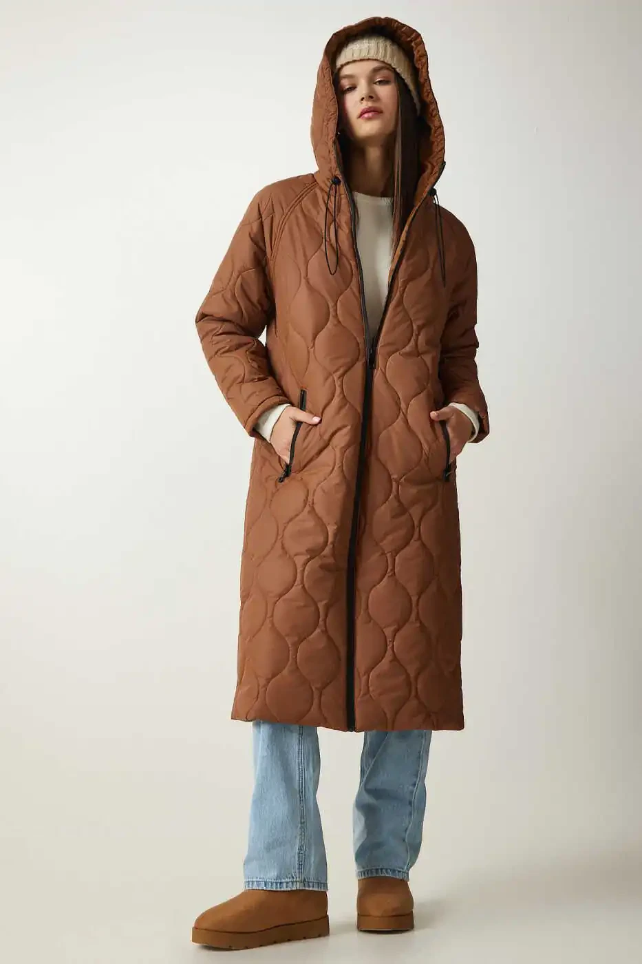 Stylish and warm women's brown hooded pocketed quilted coat. It offers both comfort and style in cold weather. With its quilted pattern and brown color, it easily adapts to any combination. Thanks to its hood, it provides protection in rainy and windy weather. You can safely carry your belongings thanks to its pockets.