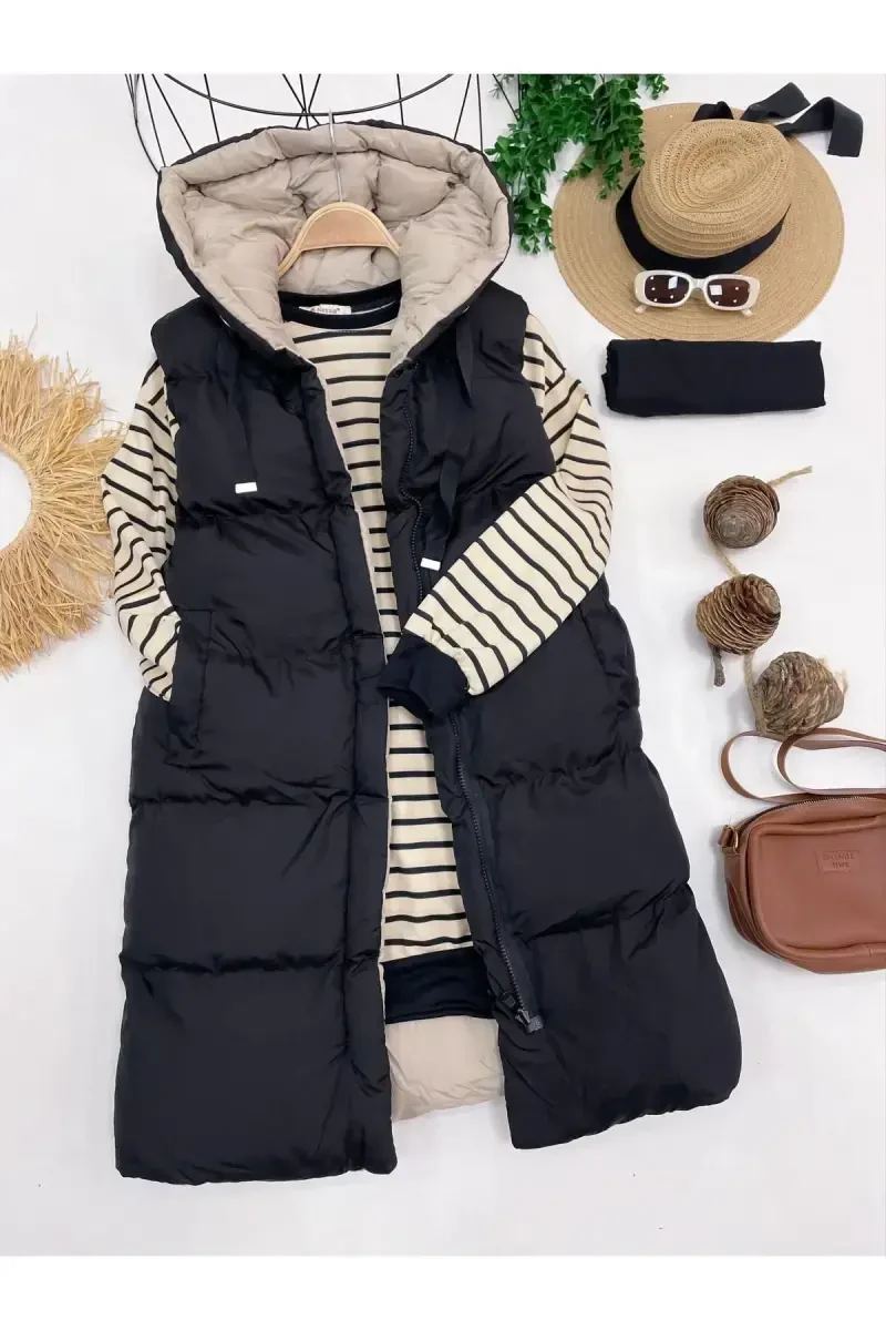 The Women's Reversible Vest-Black, meticulously designed by Moda Sindoma, is a candidate to become an indispensable part of your wardrobe by combining elegance and functionality. This special design vest offers both comfortable and durable use with its woven fabric structure, and can be easily combined with all kinds of clothes thanks to its simple and stylish appearance. The zippered closure system provides a practical use, while the regular fit cut offers freedom of movement. This fit, which gently wraps around the body lines, allows you to have a comfortable experience throughout the day. The long length design is designed in accordance with hijab clothing standards and offers both protection and elegance. The standard sleeve type is ideal for daily use and allows you to be comfortable without restricting your movements. The puffy silhouette gives a modern and trendy look, while its lightness attracts attention. The cotton and polyester blend material provides breathability and a soft touch, while the lined structure increases the feeling of extra comfort and quality. This vest, which provides extra warmth in cold weather, exhibits an elegant stance in any environment with its special design for the hijab clothing collection. Thanks to its thick structure, it offers ideal protection during seasonal transitions, while its crepe weaving type has been made more durable and its shape has been preserved in long-term use. This vest, designed for daily environments, prioritizes functionality and elegance. Zipper details add an aesthetic touch and bring practicality. Designed for a wide range of users between the ages of 21 and 40, the hooded collar type protects the head and neck area from the cold while offering a stylish look. This vest, which is a timeless choice with its black color, easily adapts to other colors. Thanks to its waterproof feature, it provides extra protection in rainy weather, while the light fiber filling technique balances lightness and warmth, providing a comfortable experience. This vest is not just a piece of clothing, but also a piece that reflects your style and gives you confidence. The Women's Reversible Vest-Black, which contains care and quality in every detail, is a candidate to be one of the most favorite pieces of your wardrobe.