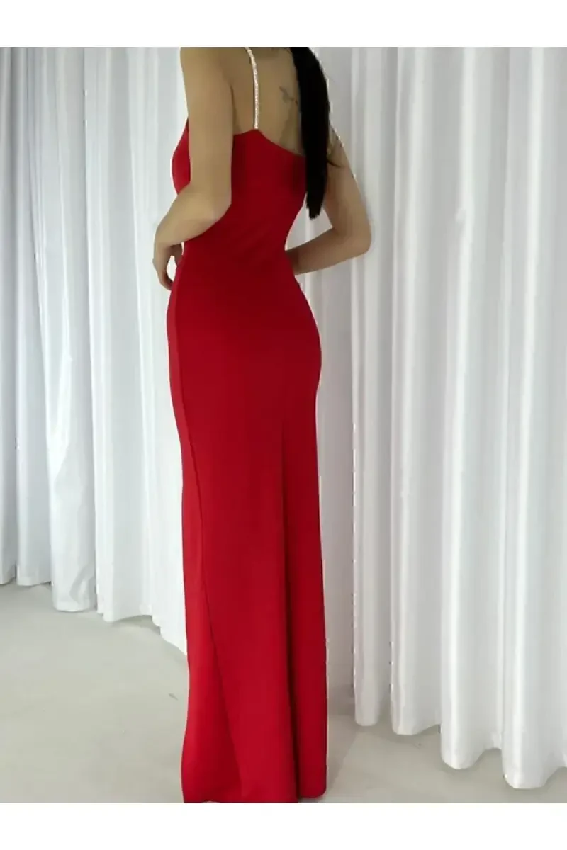 evening dress, scuba fabric, stone detailed, slit, red dress, strap dress, mini dress, slim fit, imported fabric, special occasion dress