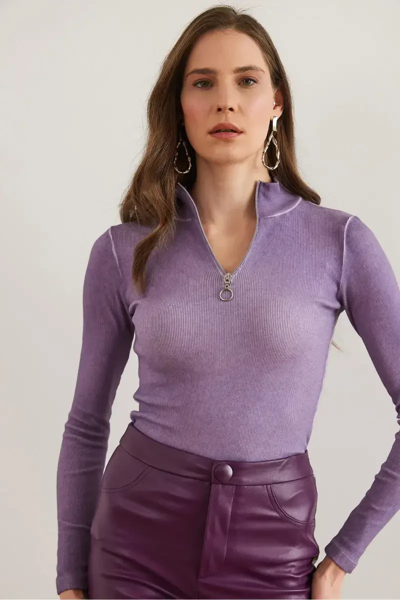 Women's Washed Lilac Zippered Turtleneck Lycra Blouse has a unique design that combines elegance and comfort. The soothing tone of lilac color easily adapts to any combination and is a candidate to be an indispensable part of your wardrobe. The zippered turtleneck detail adds a modern touch to the blouse and offers different style options. You can either close the zipper completely for a stylish look or leave it slightly open for a more relaxed and casual feel.The lycra fabric structure offers freedom of movement all day long, providing a comfortable wearing experience. Its fitted cut emphasizes your feminine silhouette while maintaining comfort. The washed fabric feature adds a vintage feel to the blouse while increasing the softness of the fabric. In this way, your blouse looks as new and stylish as the first day after each wash.The BLZ-19001155-Washed Lilac model is a versatile piece that can be worn both for daily use and on special occasions. You can combine it with jeans for a sporty chic look, or with skirts or trousers for a more classic and elegant style. It is also possible to create different styles with accessory selection. You can add a different touch to the blouse with a necklace or a stylish scarf.This blouse is produced with high quality material and workmanship. It is designed for long-lasting use and will remain in your wardrobe for many years with proper care. It is an ideal choice for women who value both elegance and comfort. While brightening your day with the energy of lilac color, let your style speak with the zippered turtleneck detail.Product DescriptionWomen's Washed Lilac Zippered Turtleneck Lycra Blouse attracts attention with its modern and stylish design. The soothing tone of lilac color easily adapts to any combination and will be an indispensable part of your wardrobe. The zippered turtleneck detail adds a modern touch to the blouse and offers different style options. The lycra fabric structure offers freedom of movement all day long, providing a comfortable wearing experience. Its fitted cut emphasizes your feminine silhouette while maintaining comfort. The washed fabric feature adds a vintage feel to the blouse while increasing the softness of the fabric. This blouse is a versatile piece that can be worn both for daily use and on special occasions, and is produced with high quality material and workmanship. It is designed for long-lasting use and will remain in your wardrobe for many years with proper care. The BLZ-19001155-Washed Lilac model is a piece that combines elegance and comfort and should be in every woman's wardrobe. You can combine it with jeans for a sporty chic look, or with skirts or trousers for a more classic and elegant style. It is also possible to create different styles with accessory selection. Let your style speak with the zipper detail and brighten your day with the energy of lilac color.Product FeaturesWashed lilac colorZippered turtleneckLycra fabricFitted cutComfortable and comfortable useSuitable for daily and special occasionsBLZ-19001155-Washed Lilac modelModern designStylish lookAdditional InformationThe size on the model is S/36. The exact content of the product is stated on its label. It is recommended to wash in the machine with similar colors. Please follow the washing instructions. There may be slight differences in the color tone of the product due to screen settings.