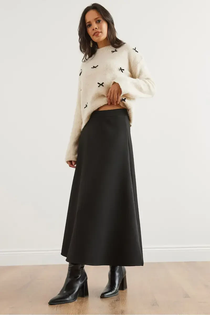 The Women's Black Maxi Flared Puf Scuba Skirt ETK-19000296, offered by Olalook official, features a unique design that combines elegance and comfort. This skirt is a candidate to become an indispensable part of your wardrobe. Thanks to its maxi length and flared cut, it offers freedom of movement, while the puf detail adds a modern and elegant touch to the skirt. The elasticity and durability of the scuba fabric provide a comfortable wearing experience all day long. Whether for a special occasion or for daily use, you can always be stylish and eye-catching with this skirt. The fit and cut on the model best reveal your body lines, while the black color is compatible with all kinds of combinations. This special skirt is an ideal choice to add a sophisticated touch to your style. It is in stock in limited quantities to be sold at a campaign price, do not miss this opportunity. Experience the privilege of owning this product with Olalook official quality on the platform where there are many sellers. Remember that Trendyol reserves the right to cancel orders over 10 pieces. Order this skirt now to complete your elegance and take its place in your wardrobe!