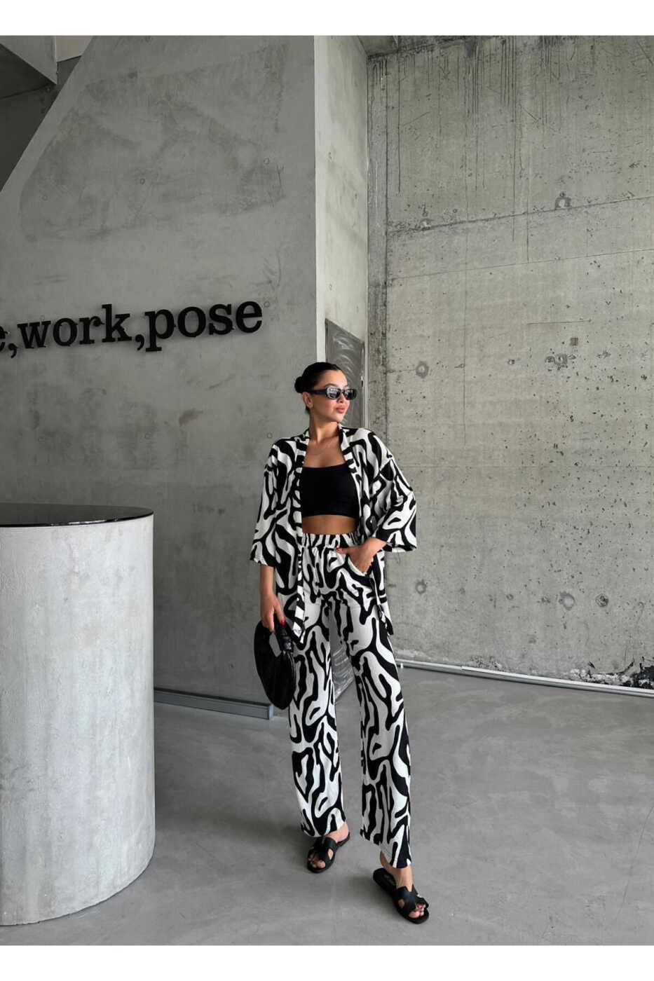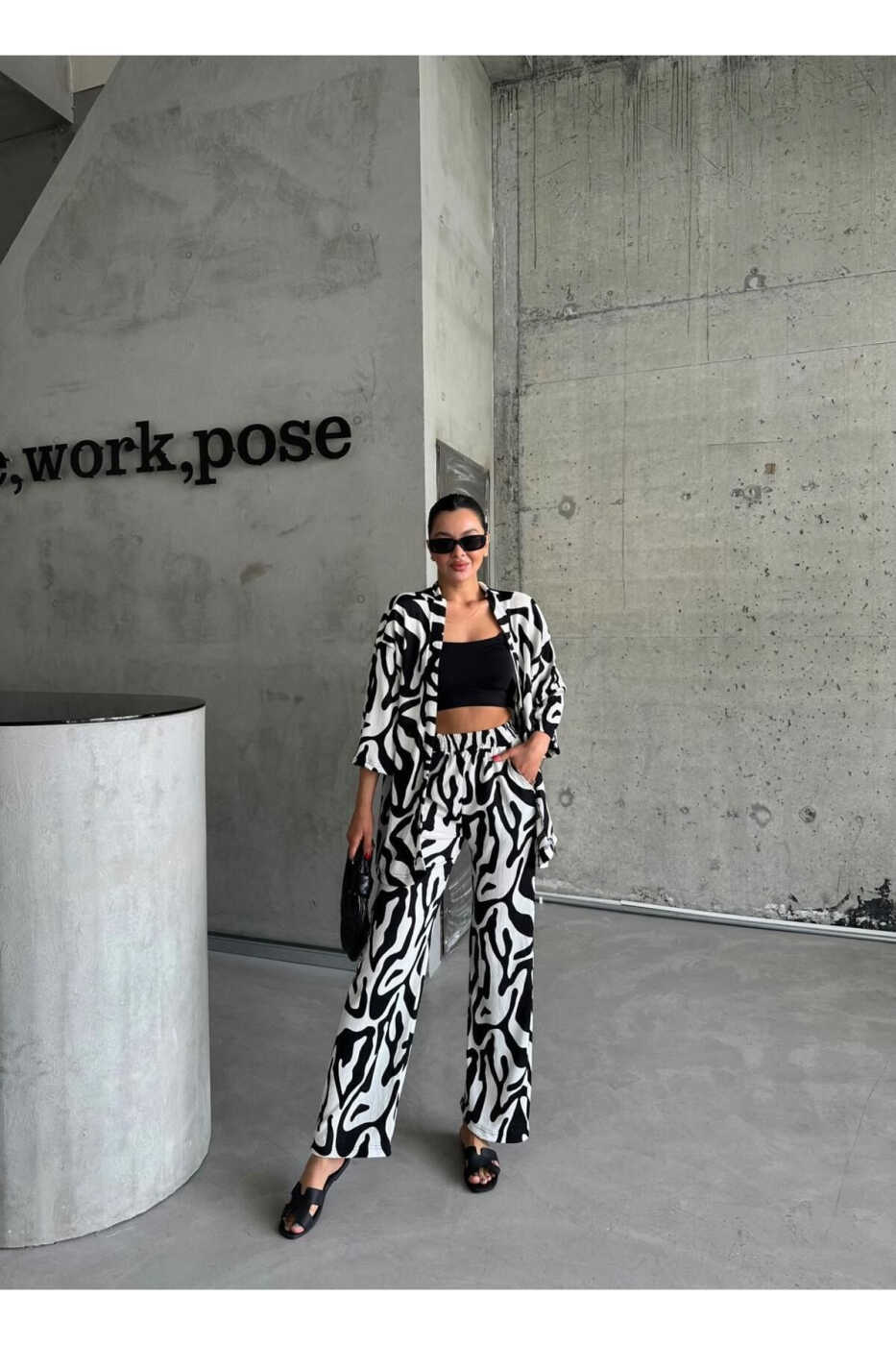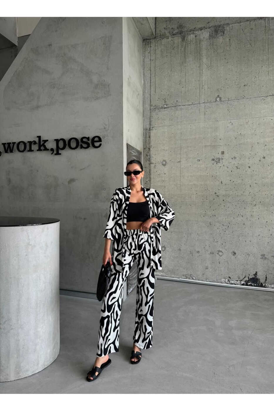 The Women's BLACK & WHITE ZEBRA Low Shoulder LONG PANTS Suit is a versatile option that you can use in all kinds of events, from everyday life to special invitations. You can create a casual look by combining it with sneakers and a stylish bag during the day, or you can create a dazzling style by complementing it with high heels and elegant accessories in the evenings.