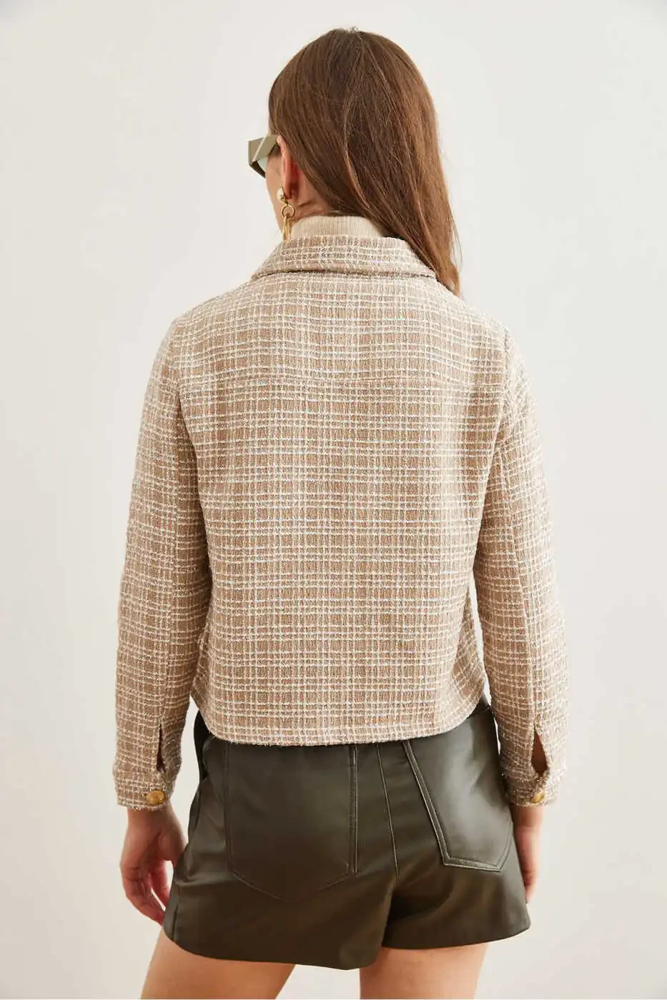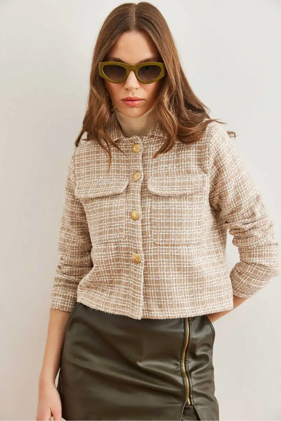 **Women's Camel Buttoned Tweed Jacket with Pockets and Stud Details CKT-19000411**Elevate your everyday style with this stunning tweed jacket that exudes sophistication. Crafted from a soft and luxurious blend of 50% cotton and 50% polyester, it offers a comfortable and flattering fit.**Details:*** **Model Name:** CKT-19000411* **Material:** 50% Cotton, 50% Polyester* **Measurements:** Length/Chest: 49/36 cm* **Model Measurements:** Height: 1.74 m, Chest: 80 cm, Waist: 60 cm, Hips: 90 cm* **Size:** S/36/1* **Color:** Camel**Features:*** Functional pockets keep your essentials secure.* Buttoned front provides ease of wear.* Stud details add a touch of glamour to the jacket.* Versatile camel color pairs effortlessly with any outfit.From casual jeans to elegant dresses, this camel tweed jacket seamlessly complements your wardrobe. Whether you're running errands or attending a special occasion, this versatile piece will effortlessly elevate your style.**Note:** Colors may vary slightly in real life due to lighting differences during studio shoots.