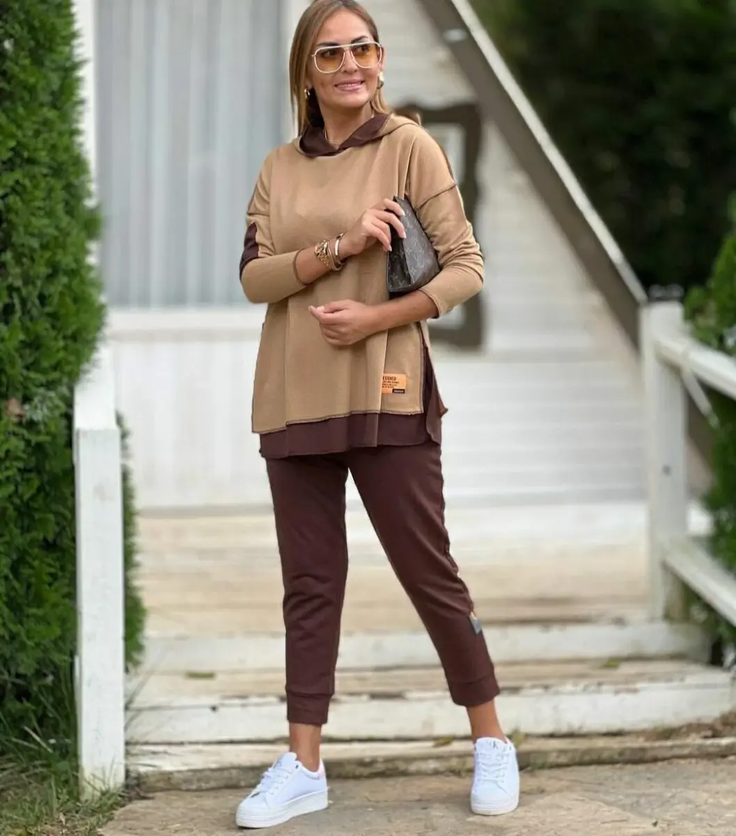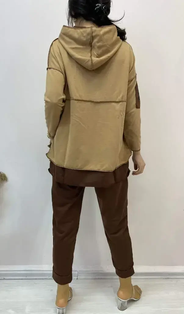 The Women's Coffee Hooded Hem Detail Patchwork Two-Piece Set is a standout choice that combines elegance and comfort with its unique design. This set, perfect for daily wear or special occasions, is a must-have in the wardrobe of modern and stylish women. The M/38 size on the model demonstrates how well the set's proportions and cut fit the body, contributing to the overall look and the wearer's comfort.This two-piece set features warm and natural tones of coffee color, while the hooded top and hem details add a distinctive touch. The hooded design offers both a sporty look and practical use by protecting your head in cool weather. The hem details add movement and originality to the set, helping you stand out from the ordinary. The patchwork detail adds character to the set, helping you highlight your style.One of the most important features of the set is its comfort. Thanks to its fabric that provides comfortable use all day long, your freedom of movement is not restricted. You can easily prefer this set whether you are relaxing at home, meeting with friends, or taking care of your daily chores. The long-sleeved top and pants make it an ideal choice for seasonal transitions and cool weather.Designed considering the model's measurements (Height: 165, Weight: 55, Bust: 90, Waist: 72, Hips: 100), this set is cut to fit different body types. The M/38 size is generally considered a medium size and is an ideal choice for women with these measurements. However, choosing the right size by considering your own body measurements will ensure that the set fits you best.The Women's Coffee Hooded Hem Detail Patchwork Two-Piece Set is not only stylish and comfortable but also offers versatile use. You can create different styles by combining the top and bottom pieces separately. For example, you can achieve a sportier look by combining the top with jeans or a skirt, or you can create a more classic style by combining the bottom with a stylish blouse or sweater. In this way, you can easily match it with other pieces in your wardrobe and create different combinations.This set is a candidate to be an indispensable part of your wardrobe. It is a choice that will appeal to every woman with its elegance, comfort, and versatile use. You can choose the Women's Coffee Hooded Hem Detail Patchwork Two-Piece Set to feel special and stylish. Remember, the right clothing choice not only enhances your appearance but also boosts your self-confidence. This set will make you feel good in every way and help you reflect your style in the best way.