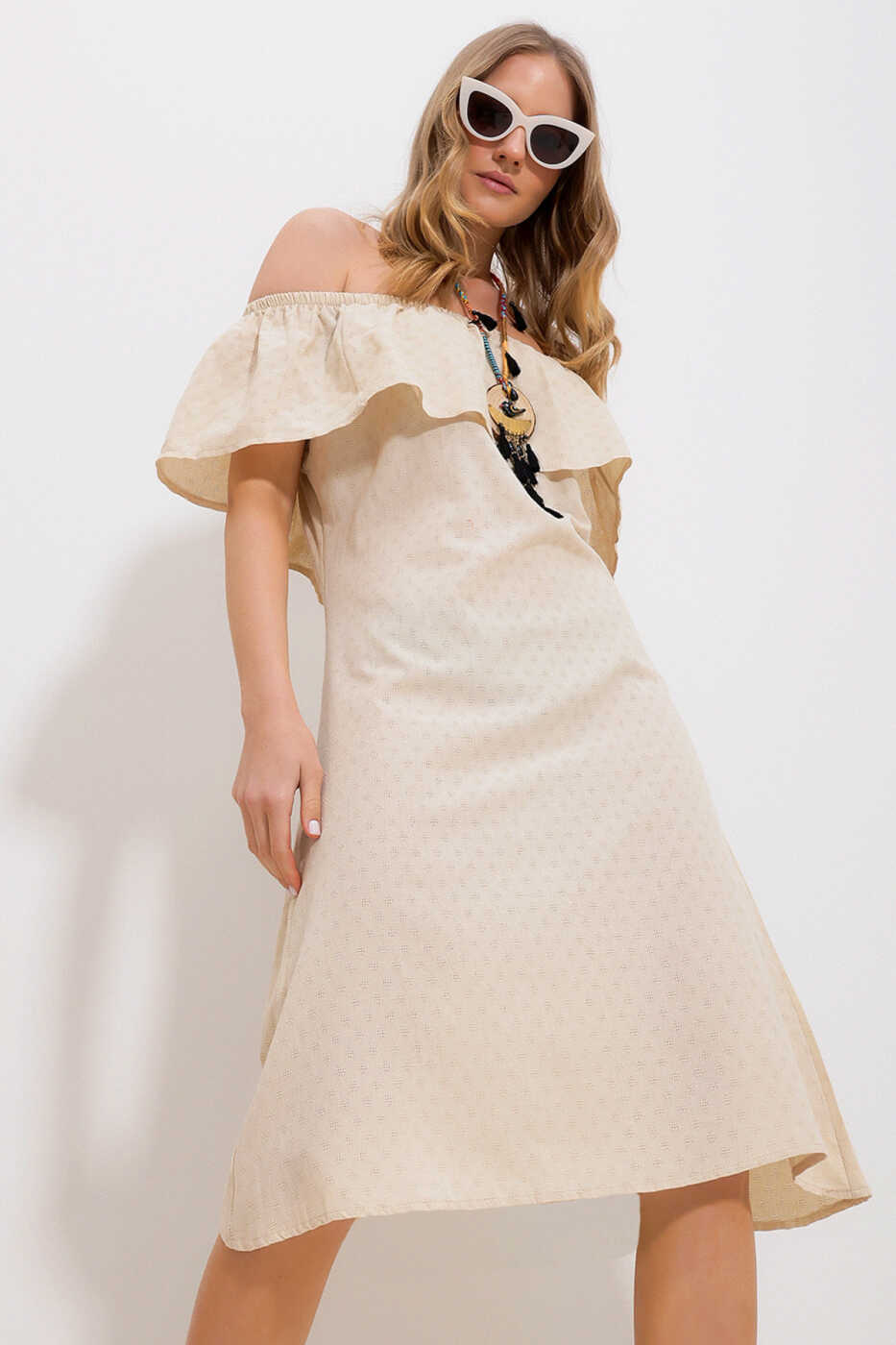 The dress's self-patterned woven fabric provides breathability and comfortable use. Its lightweight structure allows you to move comfortably all day long. The ecru color will blend with your skin, highlighting your natural beauty.