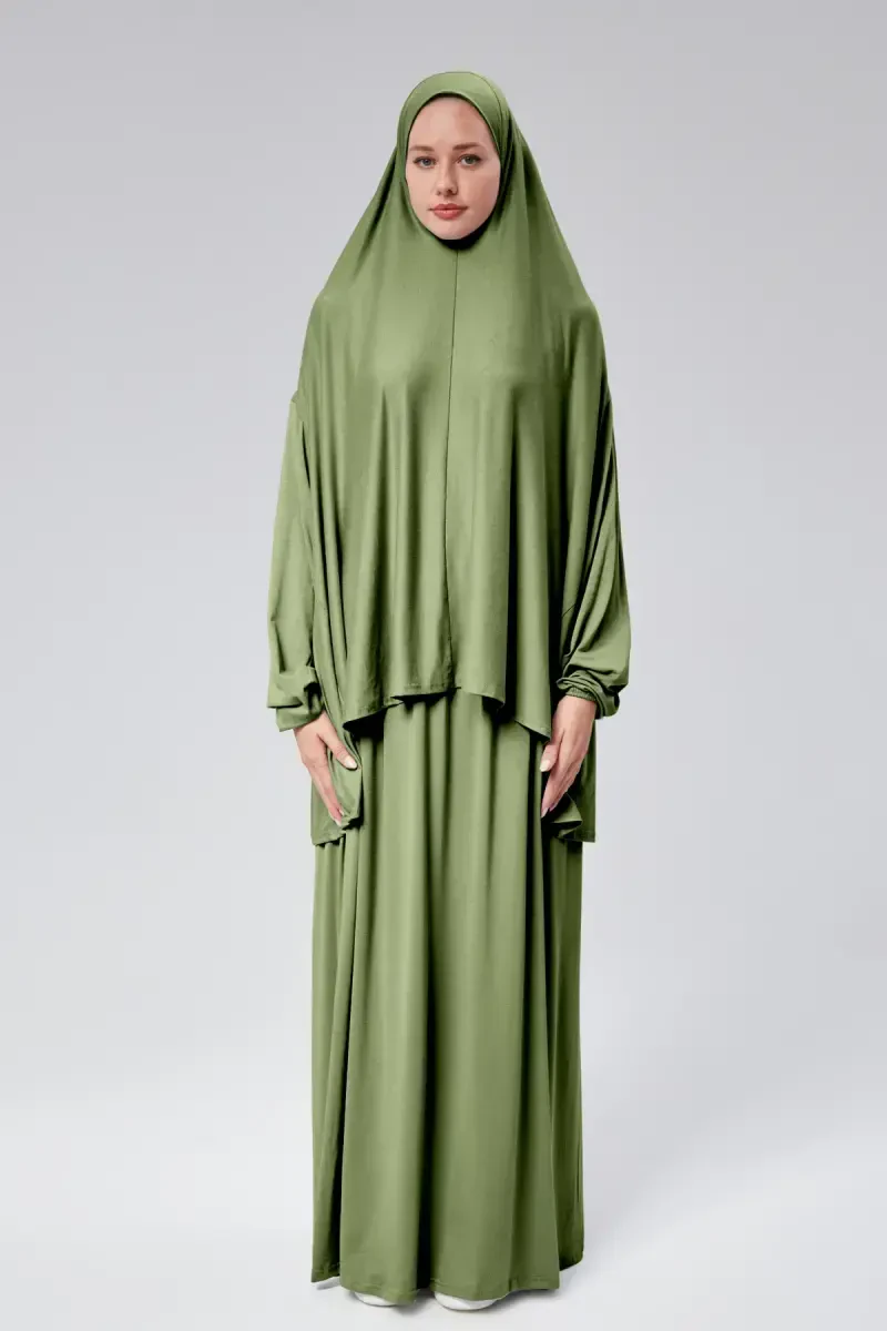 SonBaharModa's exclusively designed Women's Two-Piece Prayer Dress combines elegance and comfort with its pistachio green color. Made from organic cotton fabric and featuring a headscarf for full coverage, this dress helps you perform your prayers in peace while keeping you stylish in daily use. The flowing and comfortable cut adapts to your body, without restricting your freedom of movement. Thanks to the practical headscarf that covers your neck, you can experience full coverage without the need for a bonnet. You can remove the headscarf whenever you want and create different hijab styles in different environments. This stylish two-piece design consists of a skirt and a headscarf. The skirt offers comfortable use, while the headscarf emphasizes your elegance with its half-cape appearance from the front and back. Thanks to its lycra structure, this dress adapts perfectly to the body and guarantees your comfort even in long-term use. It is made entirely of organic fabrics and contains no polyester. Its flexible texture is resistant to wrinkles and allows your skin to breathe thanks to its breathability. Its light fabric makes it ideal for long-term and frequent use. This product, which is a lifesaver for those looking for a prayer dress, does not show through and does not slip with its quality viscose fabric. The elasticated sleeve design prevents your sleeves from slipping, allowing you to perform your prayers comfortably. It is useful and comfortable with its soft texture made of natural fibers. It eliminates the problem of sweating thanks to its high moisture retention capacity. It is suitable for frequent and long-term use with its lightweight fabric feature. Thanks to its zipperless design, it is practical and easy to wear. You can easily use this prayer dress during your Hajj and Umrah visits, and it will accompany you throughout the four seasons. It also offers ease of use with its non-ironing feature. Please note that there may be slight color differences due to factors such as light during product shooting. It is made of 94% Viscose and 6% Lycra fabric, skirt length is 102 cm, elastic waist measurement is 38 cm. The front top length of the headscarf is 90 cm (head part 24 cm), the back top length is 114 cm and the sleeve length is 57 cm. (One Size) It is a standard size. The model in the image is 1.78 cm tall and wears size 38. Wash in the most delicate program in the machine and dry and iron at low temperature. Our products are 100% domestic production.