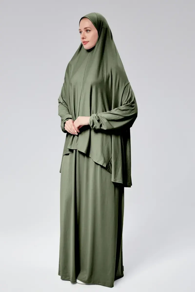 The Women's Two-Piece Prayer Dress is a stylish and comfortable modest wear option, offered with a headscarf. Thanks to its organic cotton fabric and elasticated sleeve design, it offers a comfortable wearing experience all day long. This special design, combined with the softness and comfort of jersey fabric, helps you to perform your prayers in peace while maintaining your elegance in daily use. This dress, which offers complete modesty thanks to its straight cut and headscarf that covers your neck, eliminates the need to use a bonnet. This two-piece set consists of a skirt and a headscarf and stands out with its practical use. The headscarf has a half-cape appearance from the front and back, adding a modern touch to modest fashion. Thanks to its lycra structure, it provides a perfect fit to the body and does not restrict your freedom of movement. The fact that it is made entirely of organic fabrics means that it does not contain any substances that could harm your skin. This polyester-free dress is resistant to wrinkles thanks to its flexible texture and prevents sweating thanks to its breathability. Its lightweight fabric makes it ideal for long-term use and provides comfort throughout the day. Thanks to its elasticated sleeves, it does not slip and provides convenience when performing ablution. With these features, it is also suitable for hajj and umrah visits. Thanks to its zipperless design, it can be easily put on and taken off. This product, which can be used in all four seasons, makes your life easier with its non-sweating and non-ironing features. This dress, which you can easily use while praying or in your daily activities, will be an indispensable part of your wardrobe. Please note that there may be slight color differences due to light factors during product shooting. Thanks to its quality viscose fabric, it is non-see-through and offers a stylish look. This product, which is 100% domestic production, is both high quality and economical. This product is offered with the assurance of SonBaharModa.